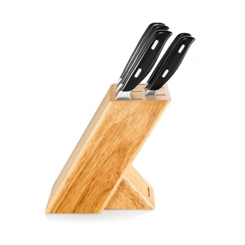 | Комплектация | - универсальный нож 9 см; - универсальный нож 13 см; - поварской нож 18 см; - разделочный нож 15 см; - нож для хлеба 21 см. |