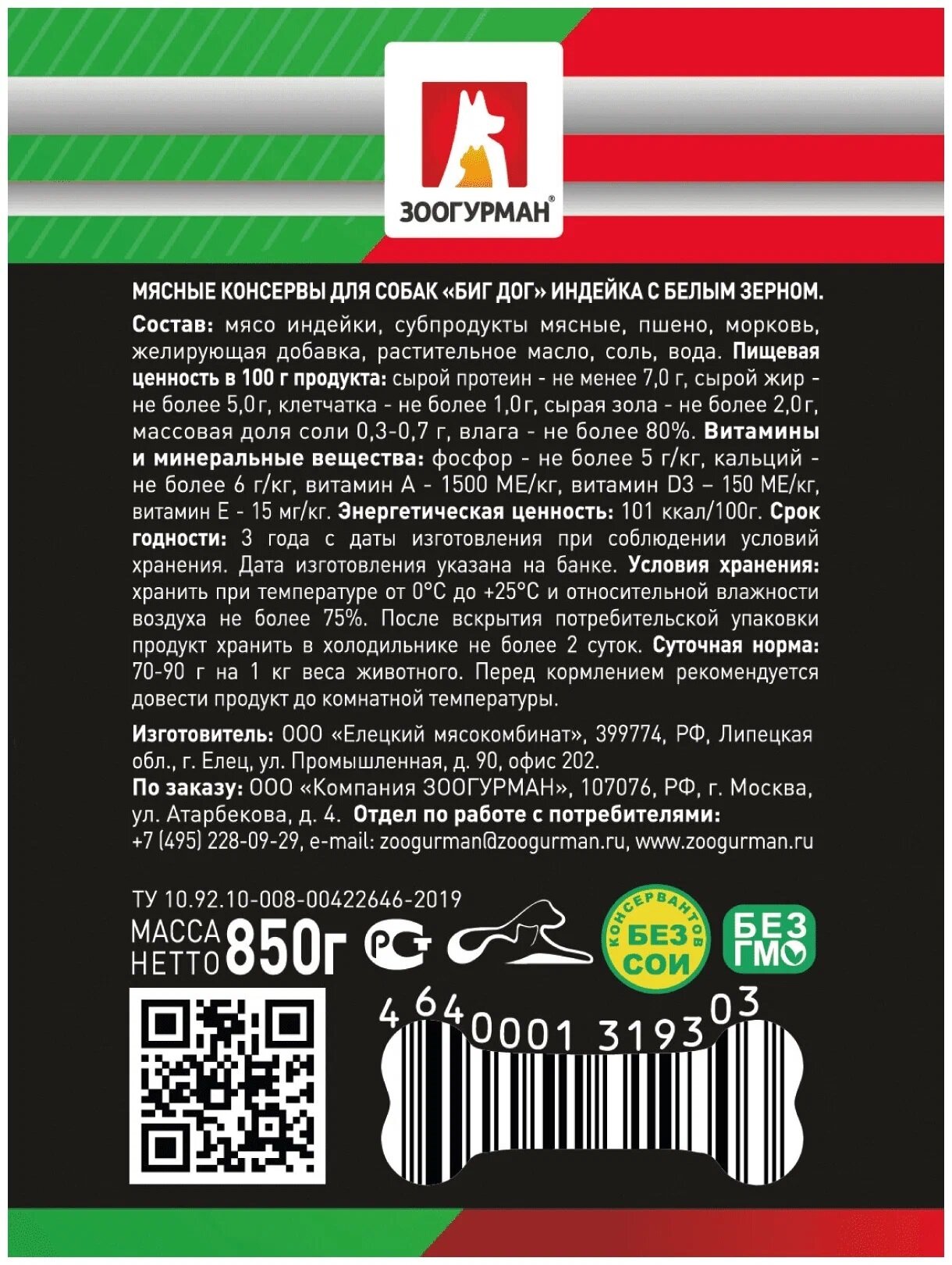 Зоогурман Консервы для собак «БигДог», индейка с белым зерном 0,85 кг 56474 (2 шт)