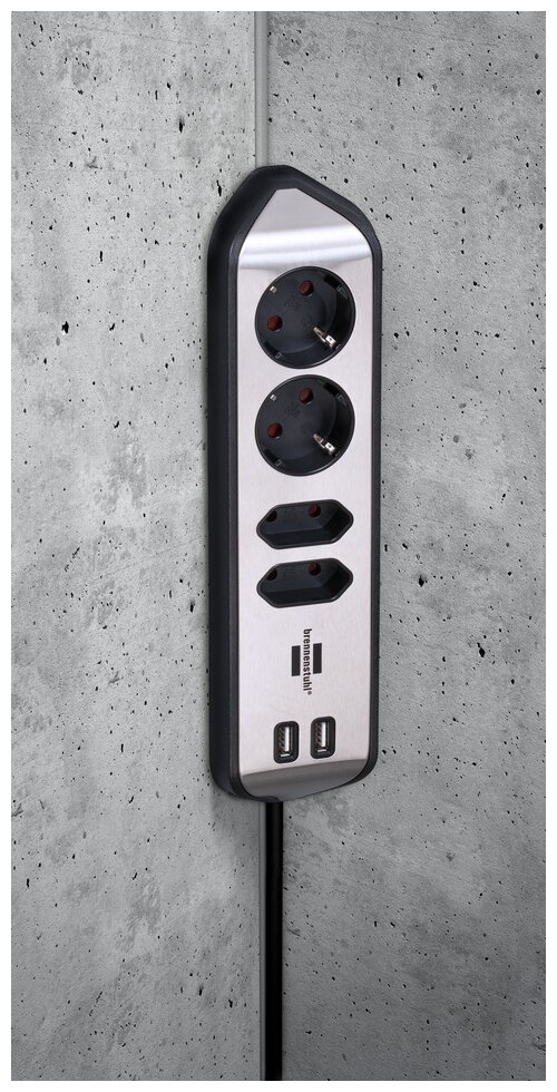 1153590410 Brennenstuhl удлинитель Extension Socket ,угловой, 2м., 4 роз., 2 USB 3,1А, серебристо-черный