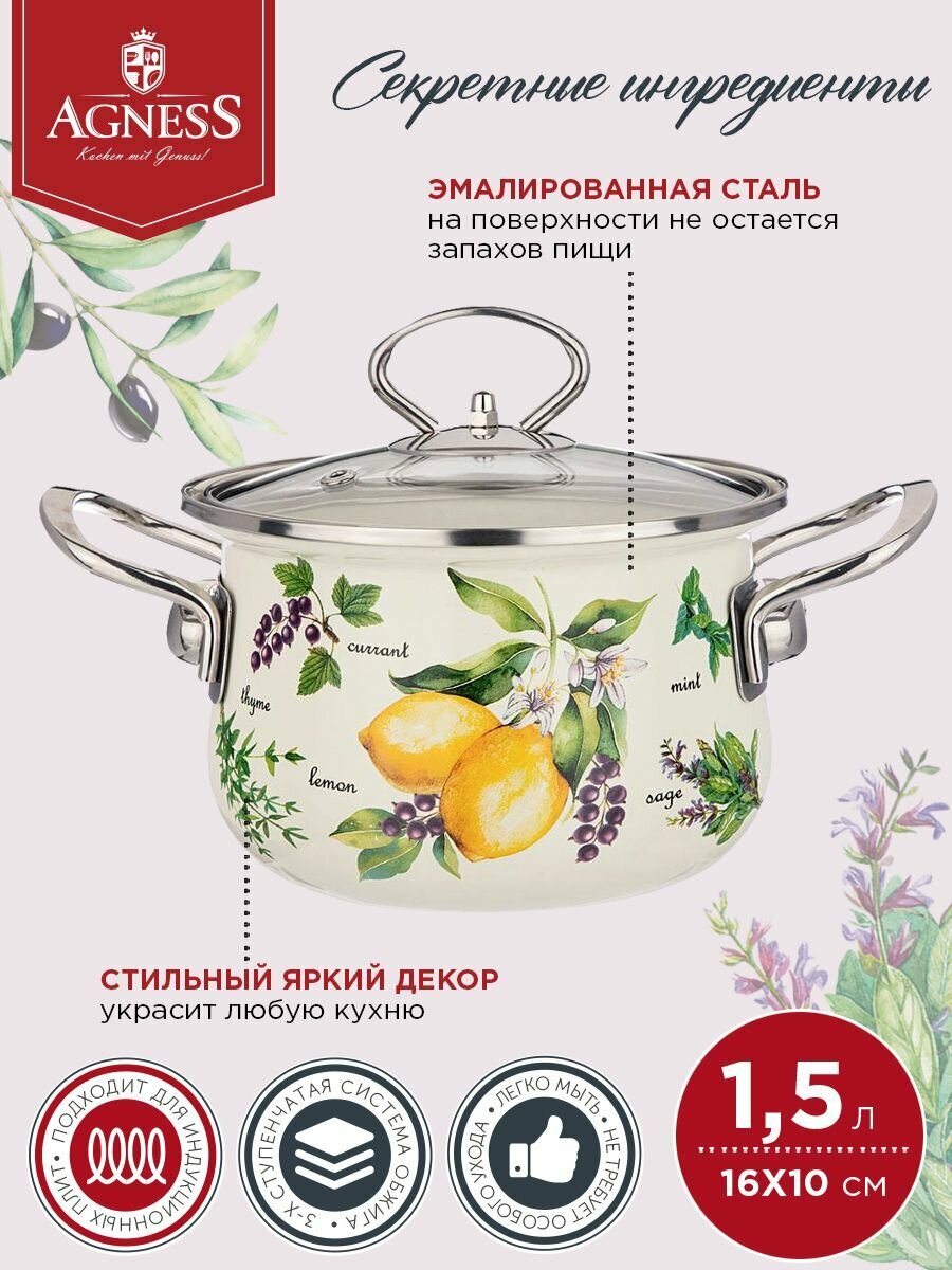 Кастрюля Agness эмалированная со стеклянной крышкой, серия "секретные ингредиенты"1.5 л, 16*10 см