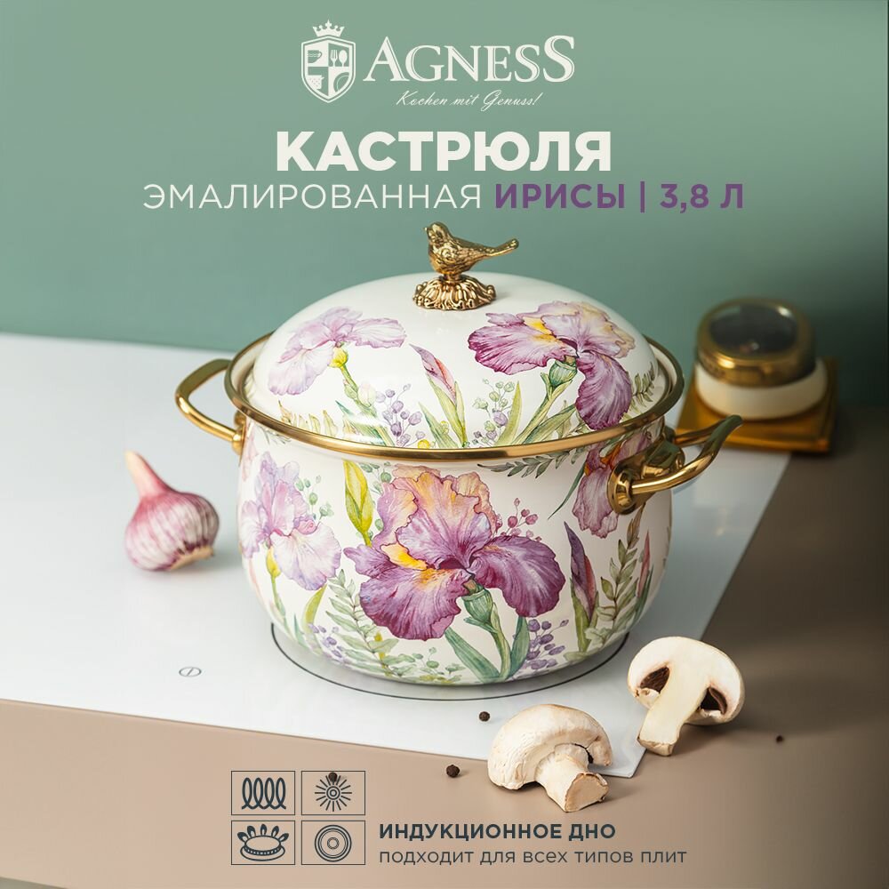Кастрюля Agness "Irises", 4,8 л, для всех видов плит, диаметр 22 см, эмалированная