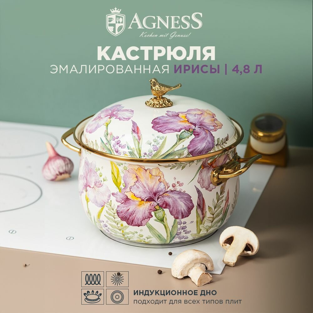 Кастрюля Agness "Irises", 4,8 л, для всех видов плит, диаметр 22 см, эмалированная