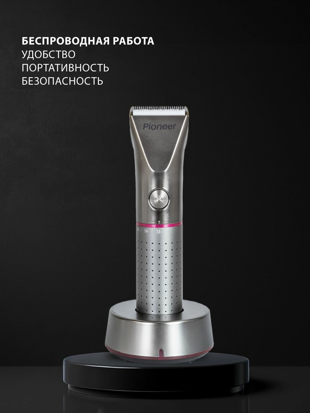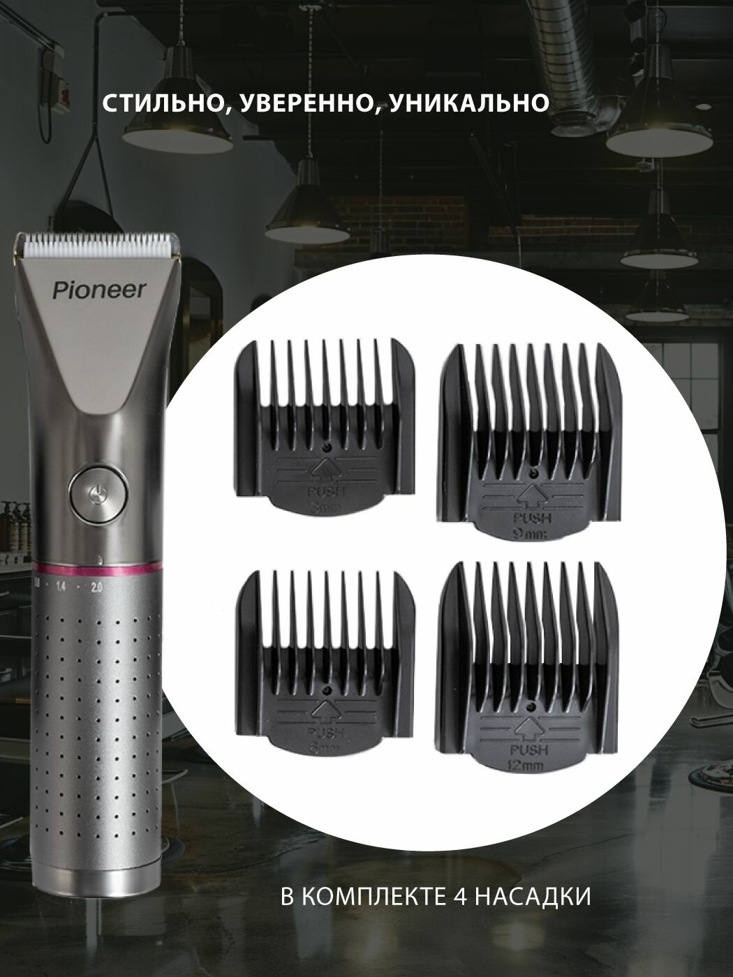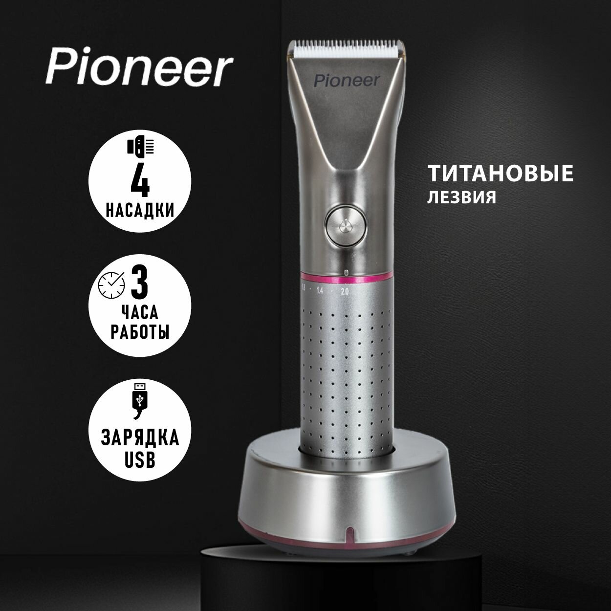 Машинка для стрижки Pioneer беспроводная портативная, 4 насадки 3 мм, 6 мм, 9 мм и 12 мм, USB-кабель, титановые лезвия