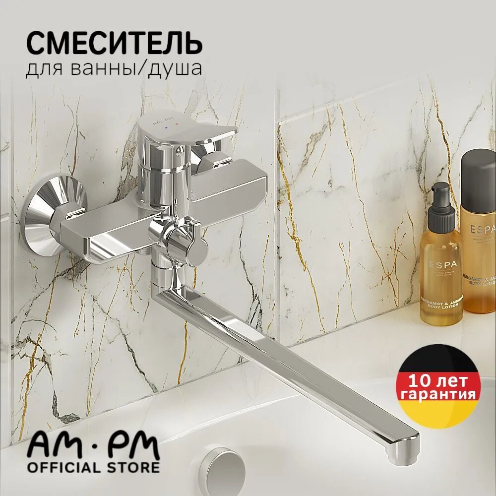 Смеситель для ванны AM.PM Brava с длинным изливом 300 мм, кран для ванной, керамический картридж, покрытие High Gloss, латунь, Гарантия 10 лет