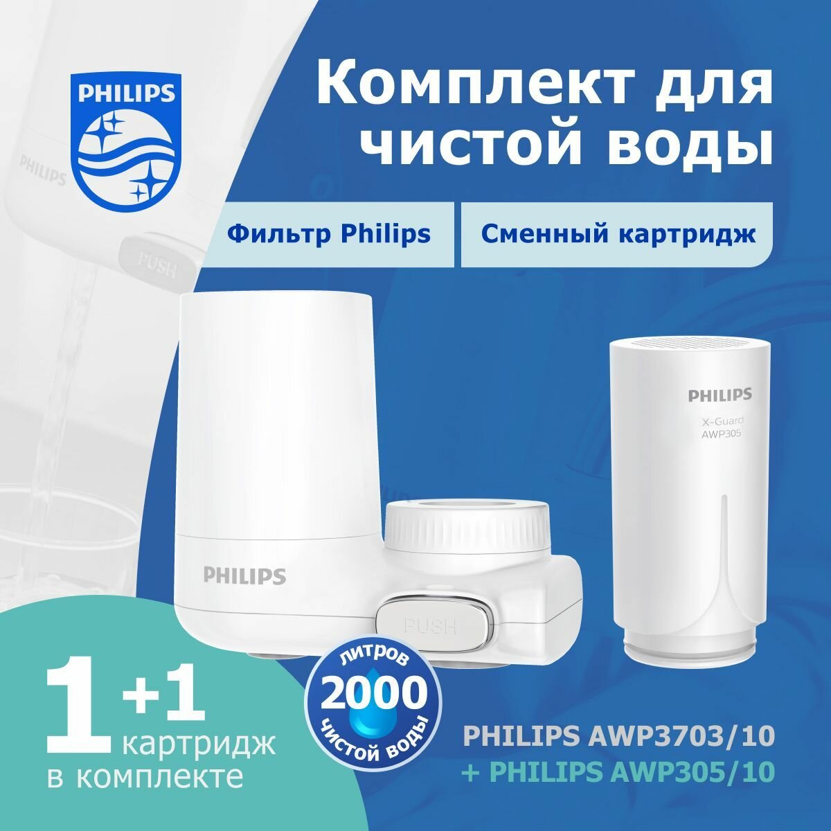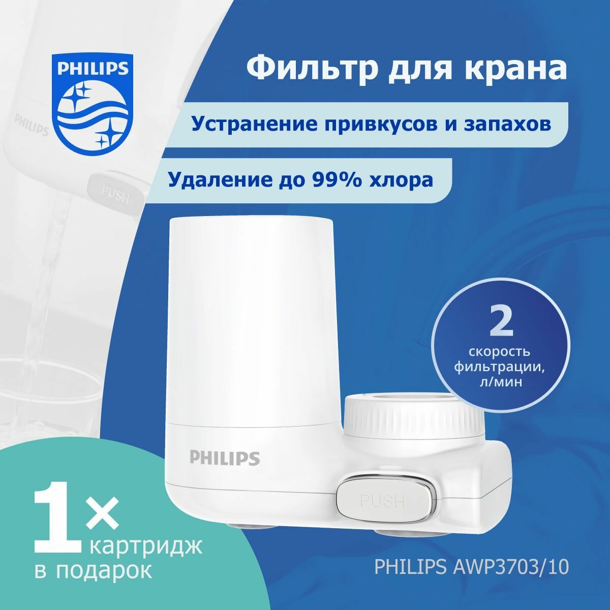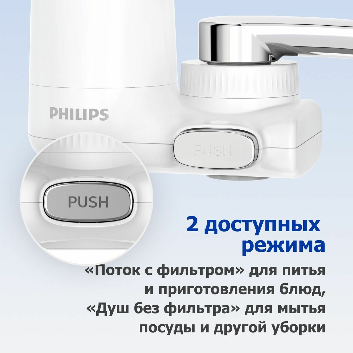 Купить Фильтр для очистки воды на кран Philips AWP3703/10, скорость 2 л/мин, ресурс 1000 л, 2 режима воды, механизм QuickTwist, таймер замены картриджа, белый
