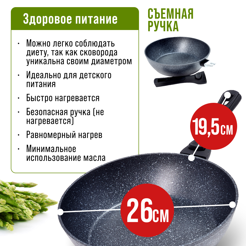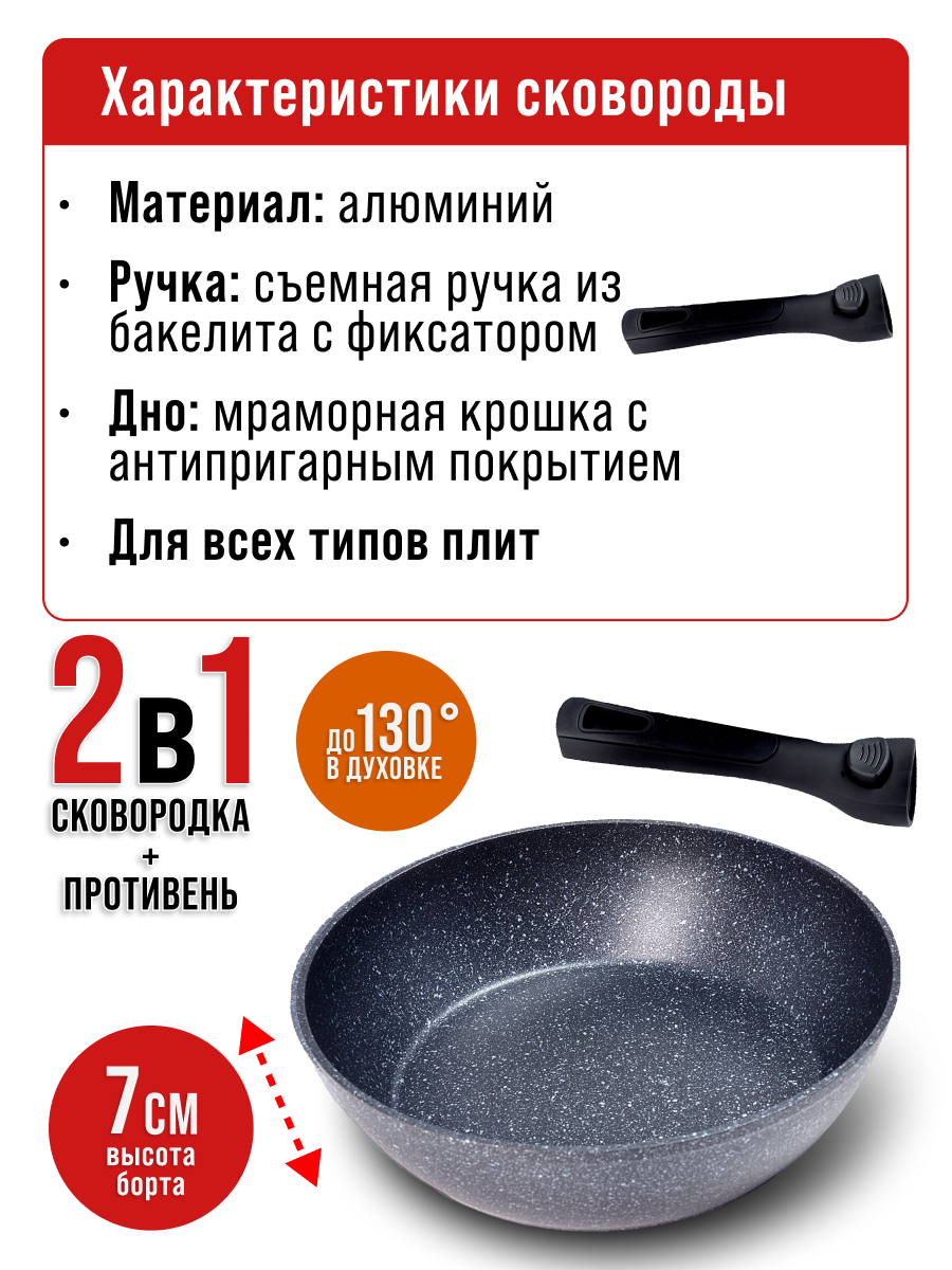 Сковорода 26 см с мраморным покрытием и съемной ручкой