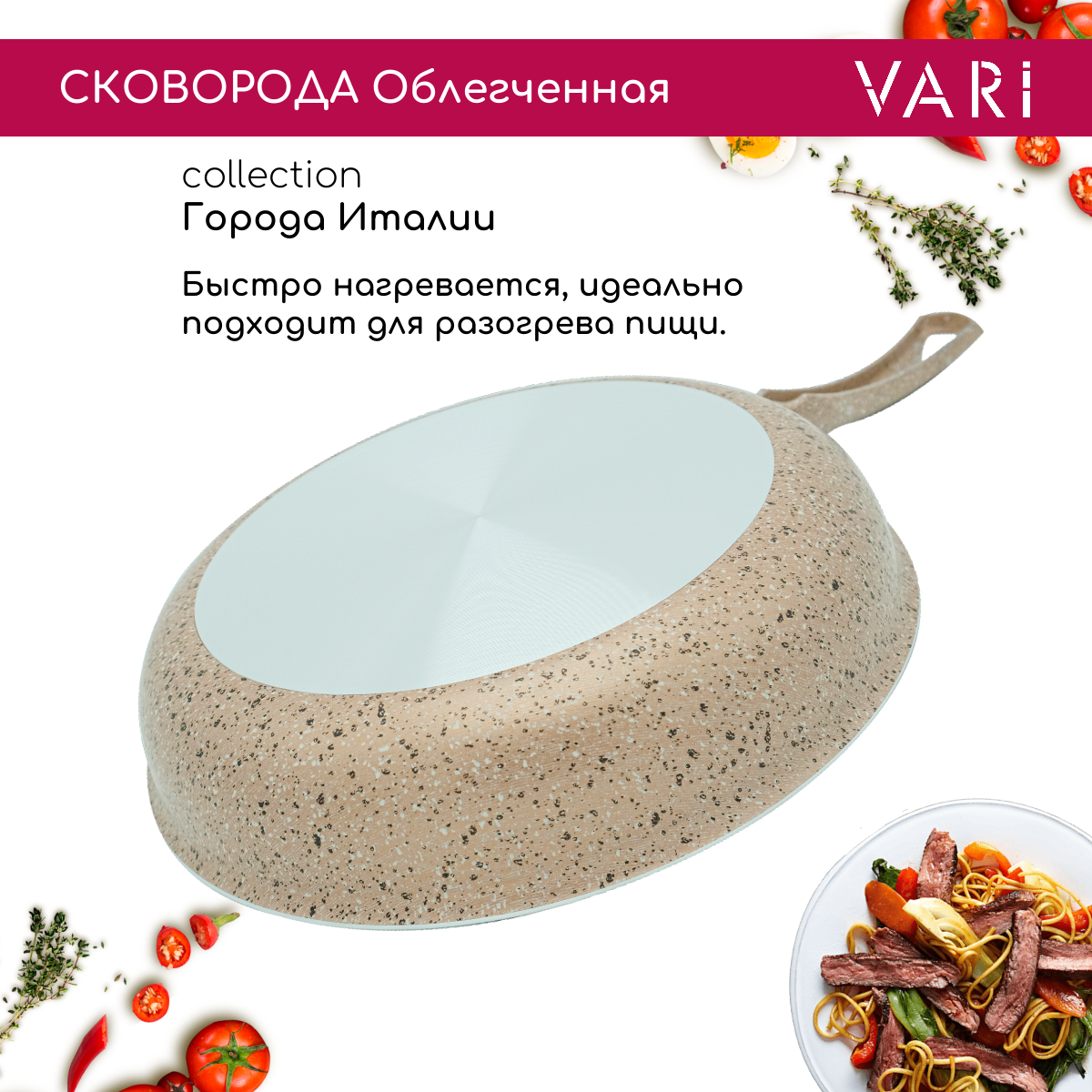 СохранитьСковорода VARI "Города Италии" 24 см коричневый гранит, с антипригарным покрытием из безопасного пищевого алюминия и жаропрочной бакелитовой ручкой , можно мыть в посудомоечной машине интересное: