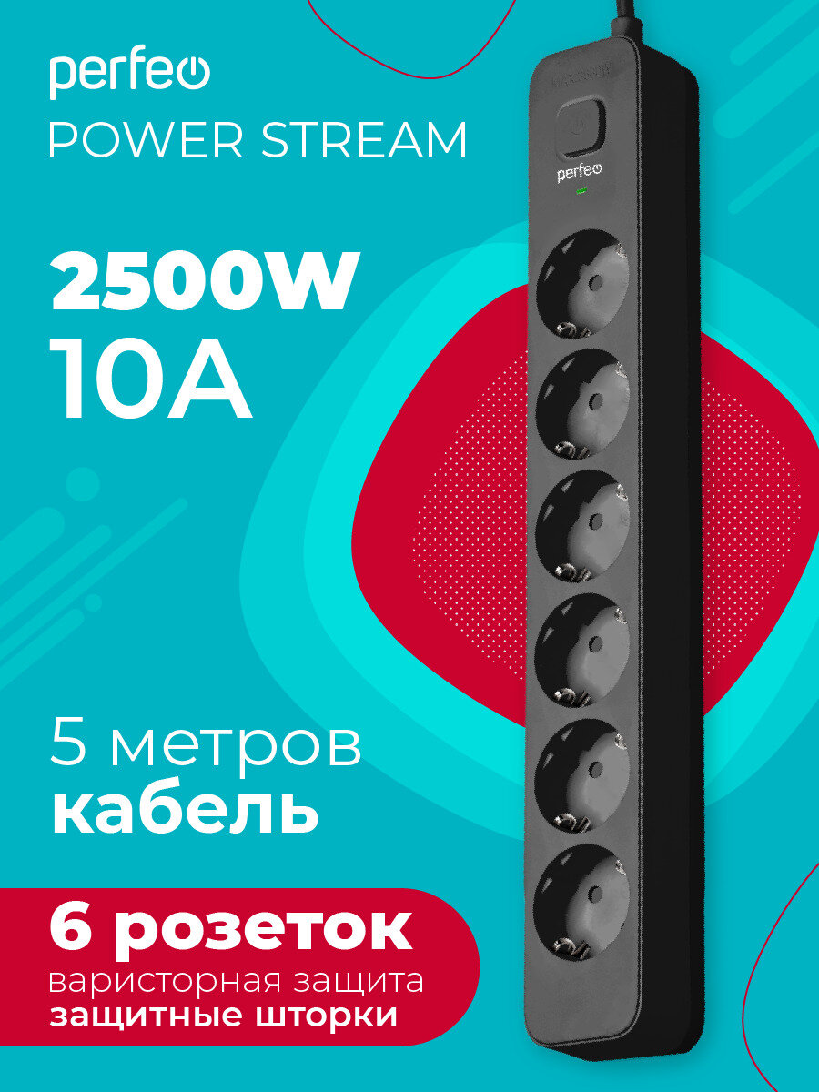 Perfeo, сетевой фильтр, POWER STREAM, 2500W, 5 метров, 6 розеток, черный