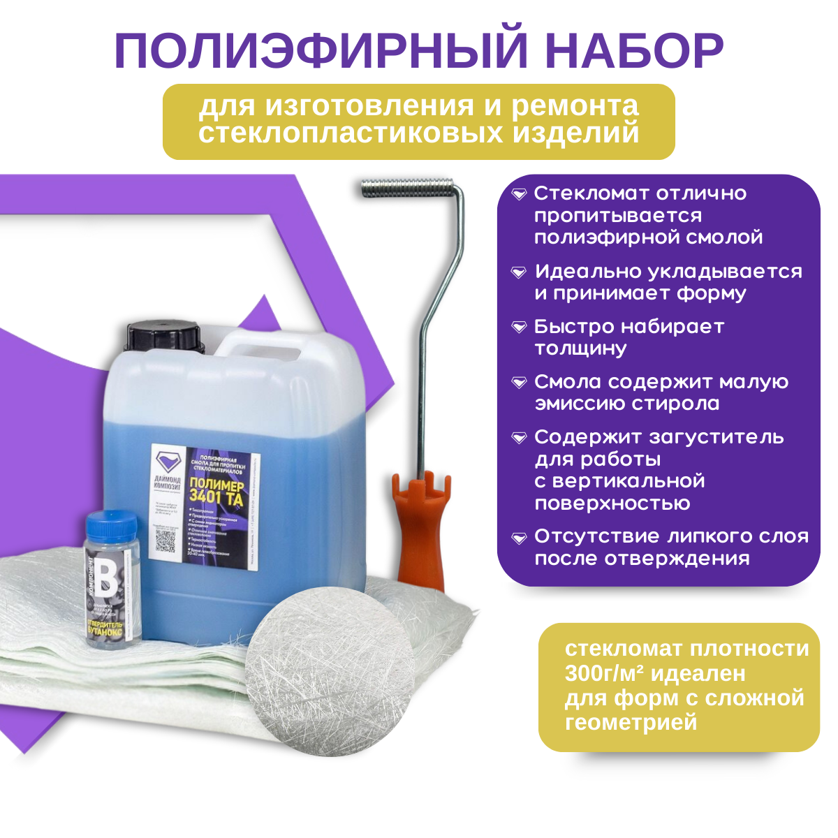 Купить Набор для ремонта стеклопластика (полиэфирная смола 5кг, стекломат 300 - 5м) + валик прикаточный 10х50 в подарок