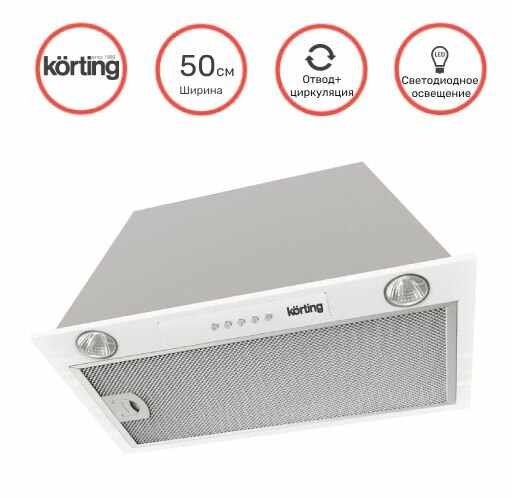 Встраиваемые вытяжки Korting/ Полностью встраиваемая, в шкаф 60см, 3 режима, 450 м3/ч., алюминиевый жировой фильтр, 2 лампы освещения LED, ур.шума 50 дб, угольный фильтр в комплекте, белая