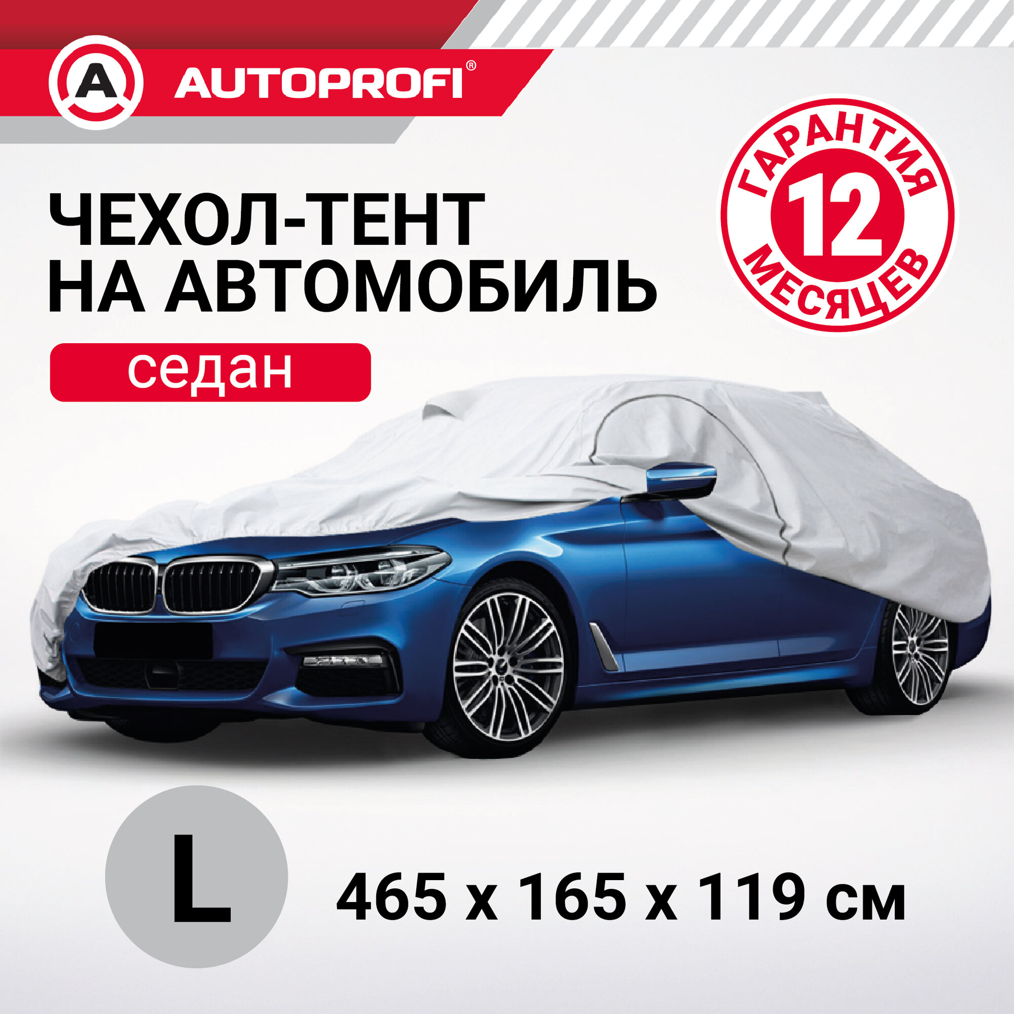 Тент-чехол на автомобиль AUTOPROFI, седан, водонепроницаемый, двойные швы, два вентиляционных окна, молния для двери водителя, 2 ремня для фиксации тента, 465х165х119 см. разм. L