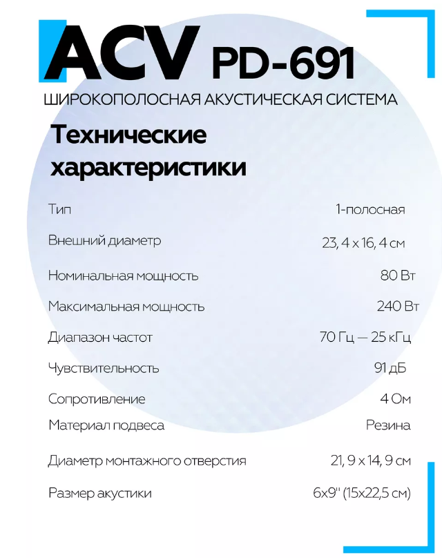 Колонки автомобильные ACV PD-691 (без решетки) 240Вт 91дБ 4Ом 16x23см (6x9дюйм) (ком.:2кол.) коаксиальные однополосные