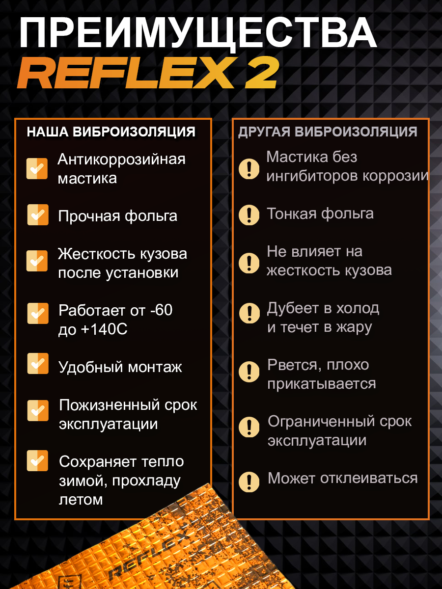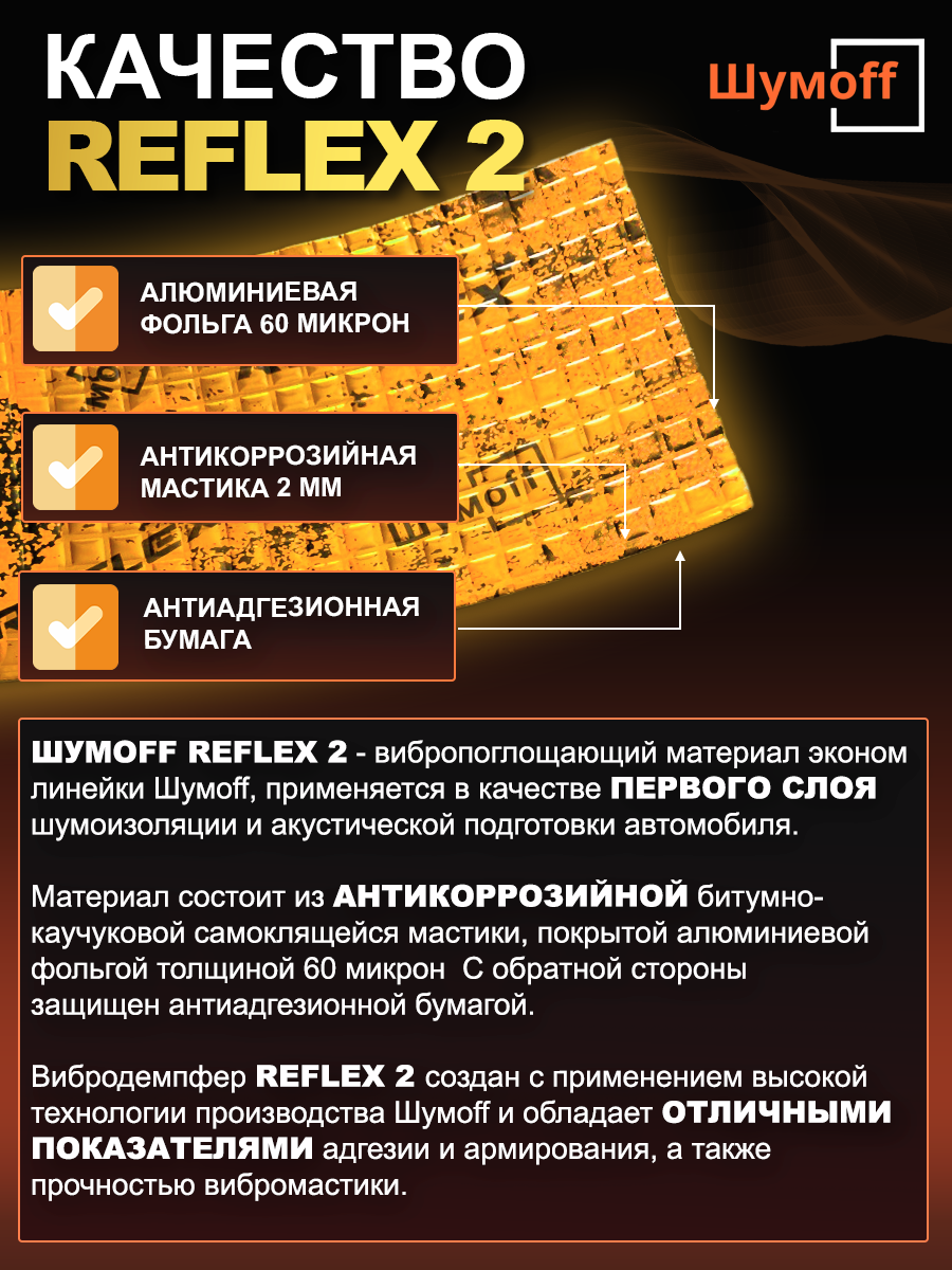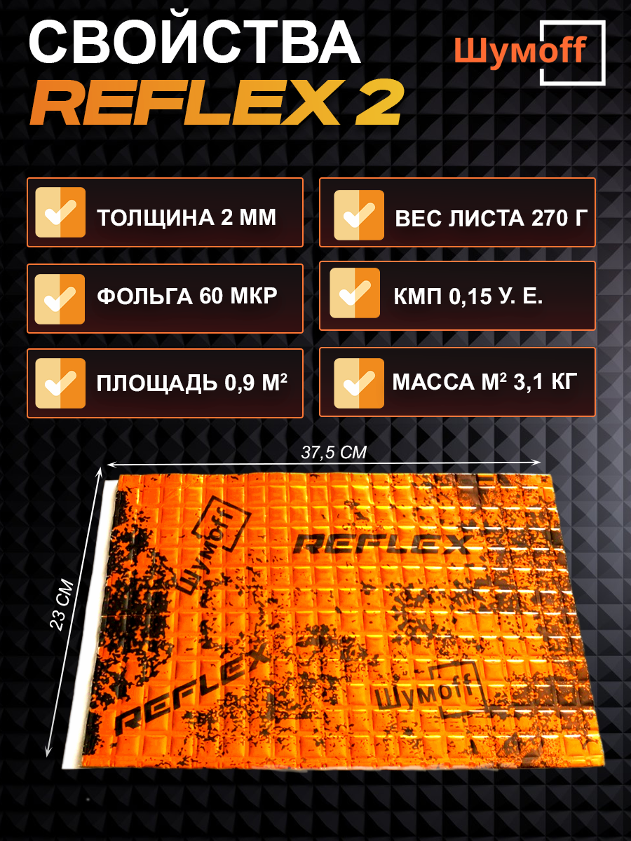 Шумофф Reflex 2 - 36 листов 37.5 см х 23 см Виброизоляция для автомобиля - для потолка, дверей, капота, багажника - толщина 2.0 мм