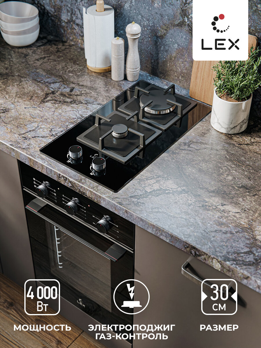 Варочная панель газовая Lex GVG 324 BBL, мощность 4000 Вт, автоматический электроподжиг, газ-контроль, черная