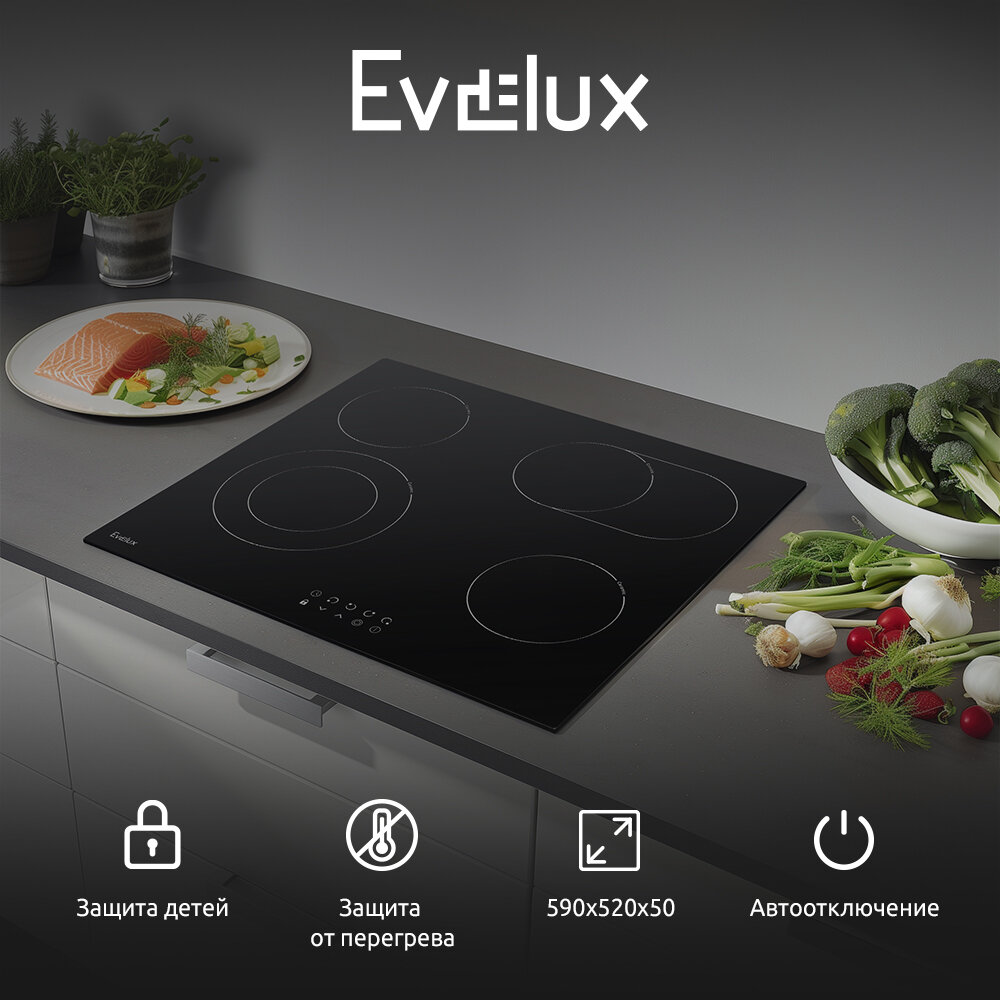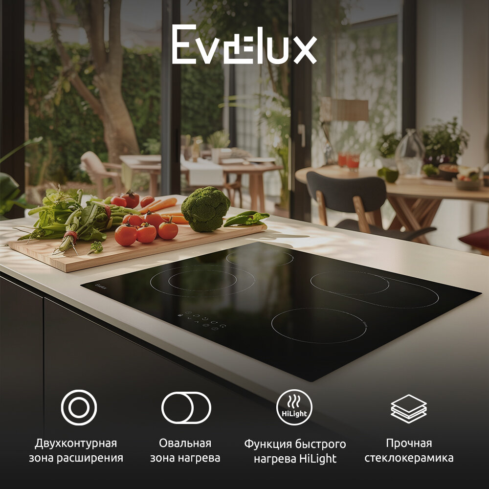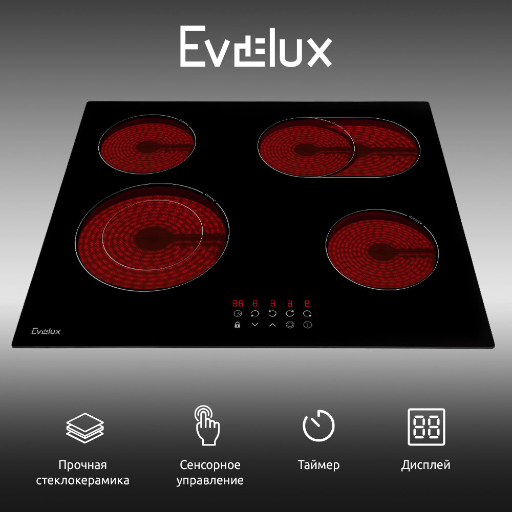Варочная панель EVELUX электрическая, стеклокерамика, Hi Light, 60 см, 4 конфорки, сенсорное управление, 9 уровней мощности, таймер 1-99 мин, блокировка управления, защитное отключение, двухконтурная, овальная зона, 6600 Вт, черное стекло, 590х520х50 мм.