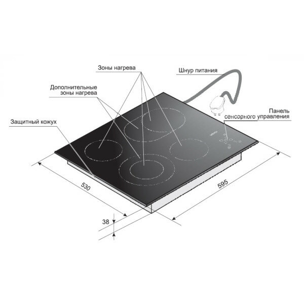 | Безопасность | защитное отключение конфорок / кнопка блокировки панели / индикатор остаточного тепла |