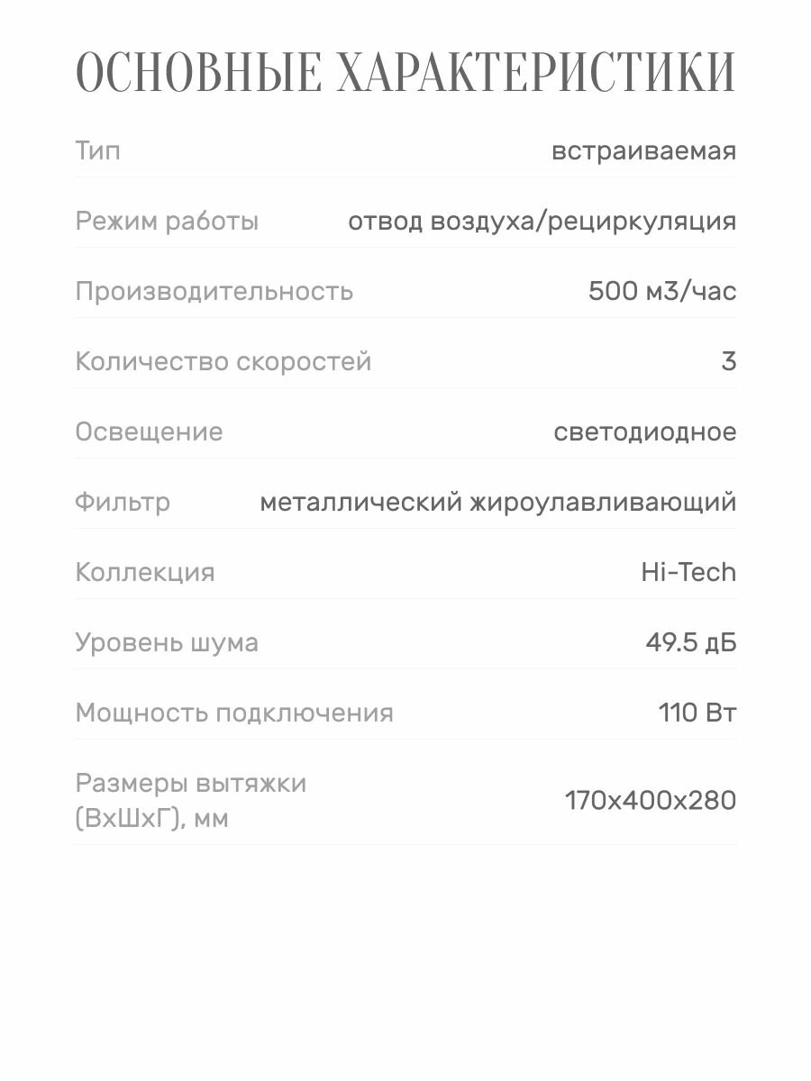 | Плюсы: | Из встраиваемых узких вытяжек самая мощная и компактная