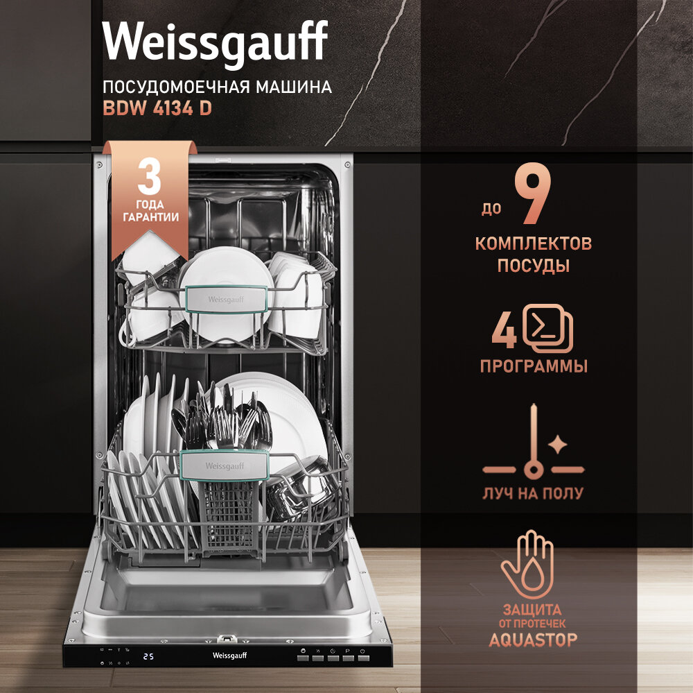 Встраиваемая посудомоечная машина с лучом на полу Weissgauff BDW 4134 D (модификация 2024 года),3 года гарантии, Полная защита от протечек, Внутренняя подсветка, 9 комплектов, 4 программы, Быстрая мойка, Автоматическая программа, Мойка 60 мин, Дисплей