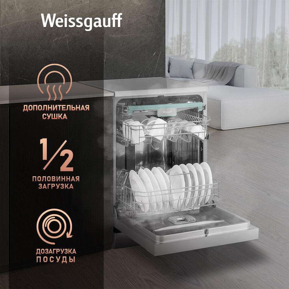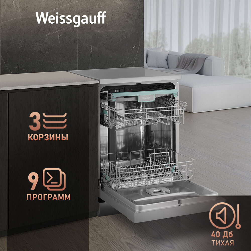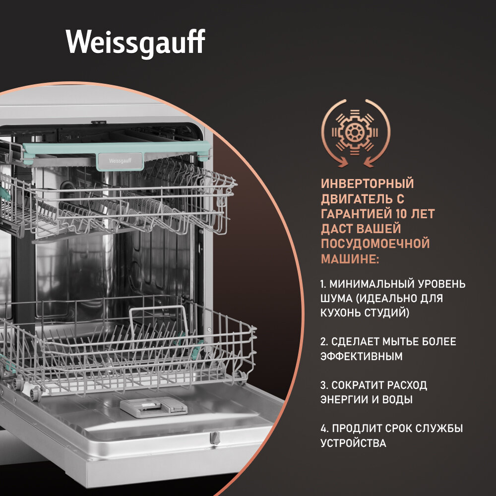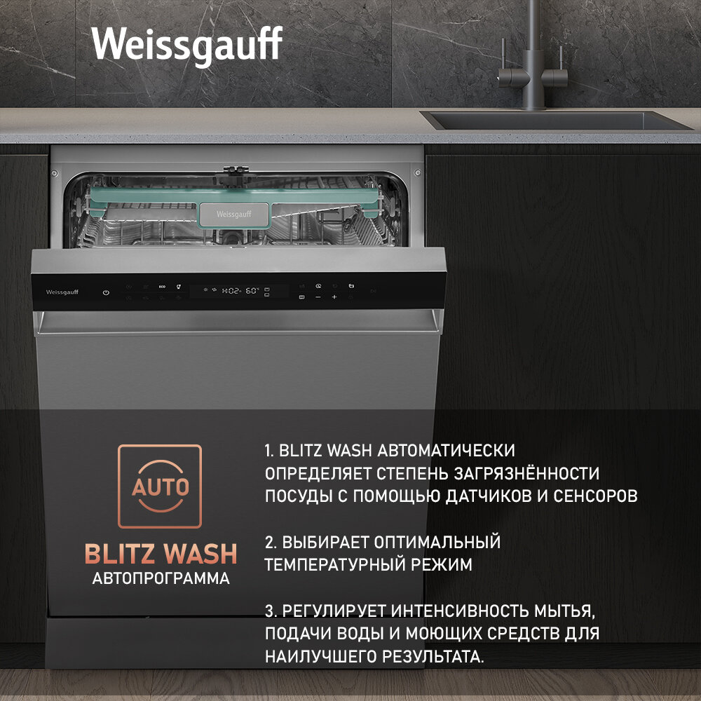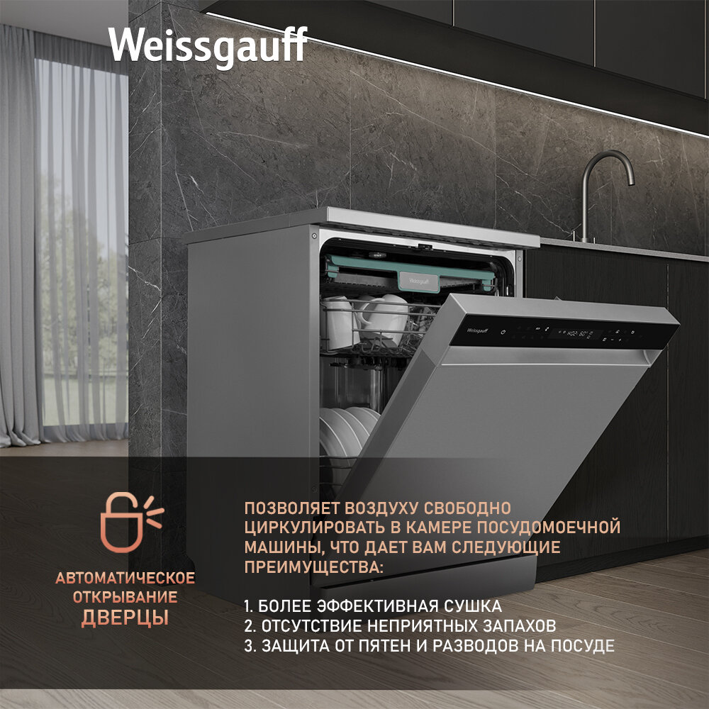 Посудомоечная машина с авто-открыванием и инвертором Weissgauff DW 6138 Inverter Touch Inox,3 года гарантии, 14 комплектов посуды, 9 программ, самоочистка, быстрая мойка, режим стерилизации, дополнительная сушка, таймер, блокировка от детей