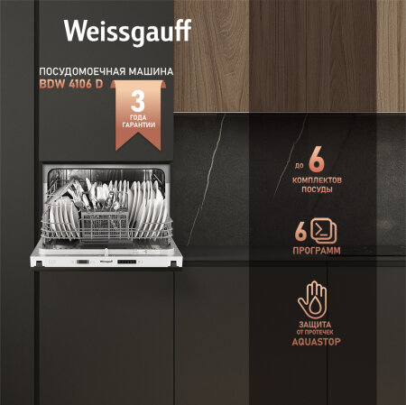 Встраиваемая компактная посудомоечная машина Weissgauff BDW 4106 D,полная защита от протечек Aquastop, 3 года гарантии, 6 программ, 6 комплектов посуды, цифровой дисплей, таймер, дозагрузка посуды