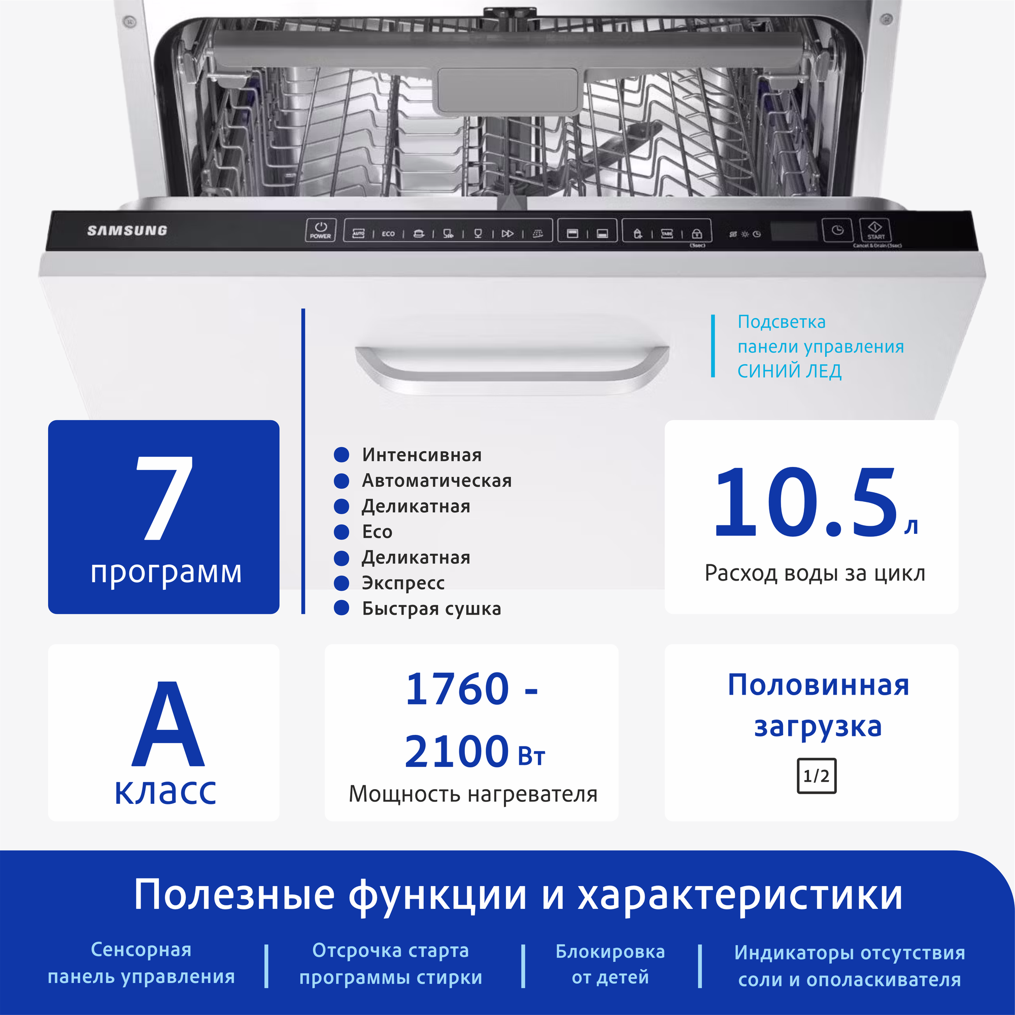 | Программы | экономичная / быстрая / деликатная / интенсивная / режим половинной загрузки / предварительное ополаскивание/замачивание / автоматическая |
