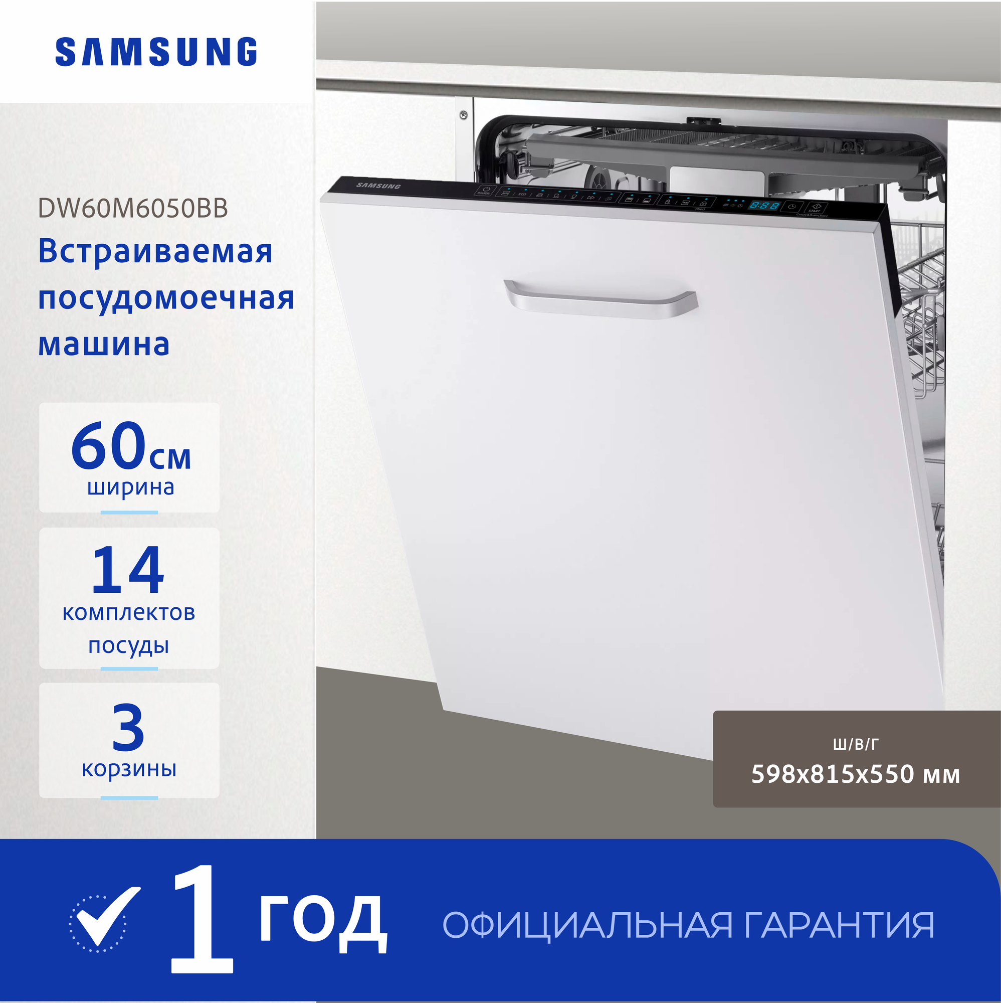 Встраиваемая посудомоечная машина для кухни Samsung DW60M6050BB/WT, 2100 Вт, 60 см, с 7 автоматическими программами, 3-ей корзиной, вместимостью до 14 наборов посуды, защитой от протечек, белая