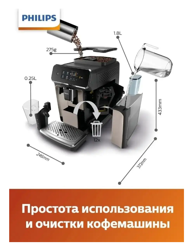 Кофемашина Philips Series 2200 EP2236 LatteGo, черный, давление 15 Бар