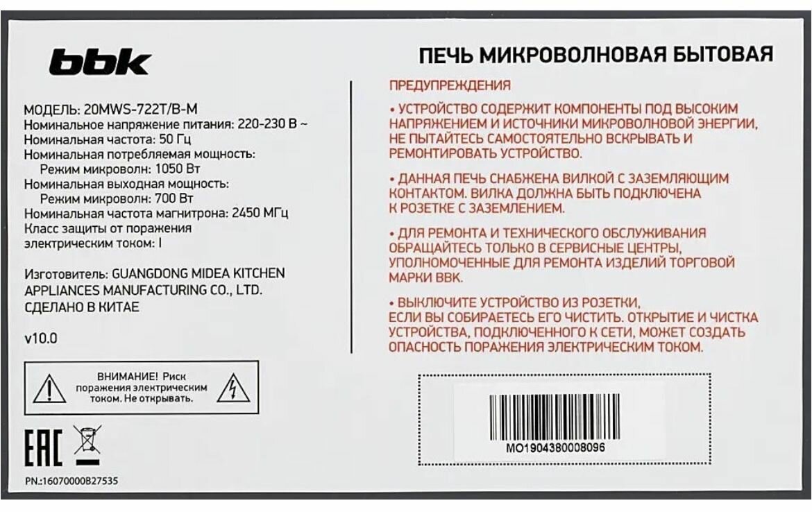 Микроволновая печь BBK 20MWS-722T/B-M .