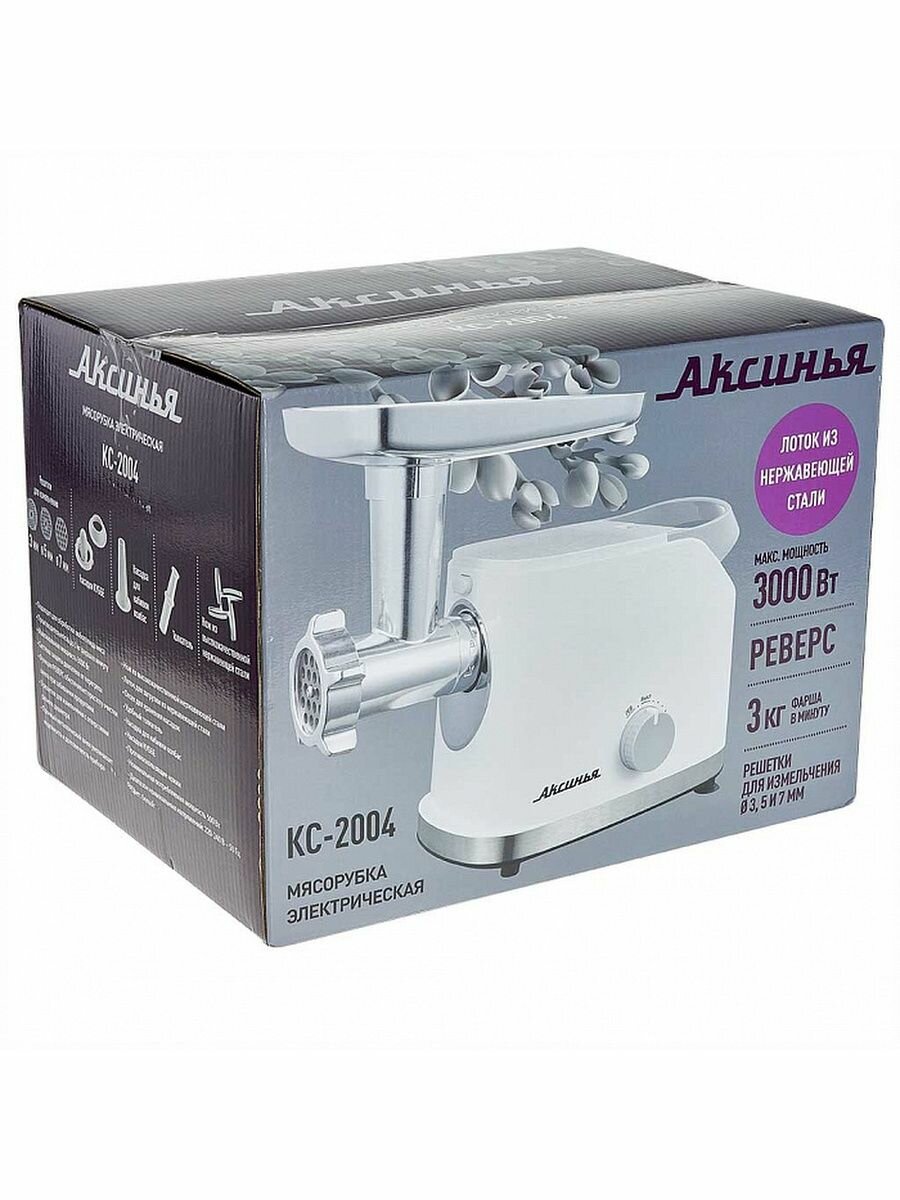 Мясорубка Аксинья КС-2004 белый : 3000 Вт, Нерж. Лоток, 3кг/мин,3 диска