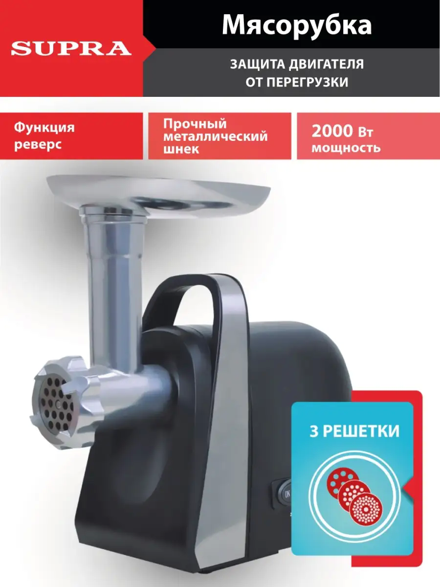 Мясорубка электрическая SUPRA с реверсом, 3 решетками 3 мм, 5 мм и 7 мм, 2000 Вт