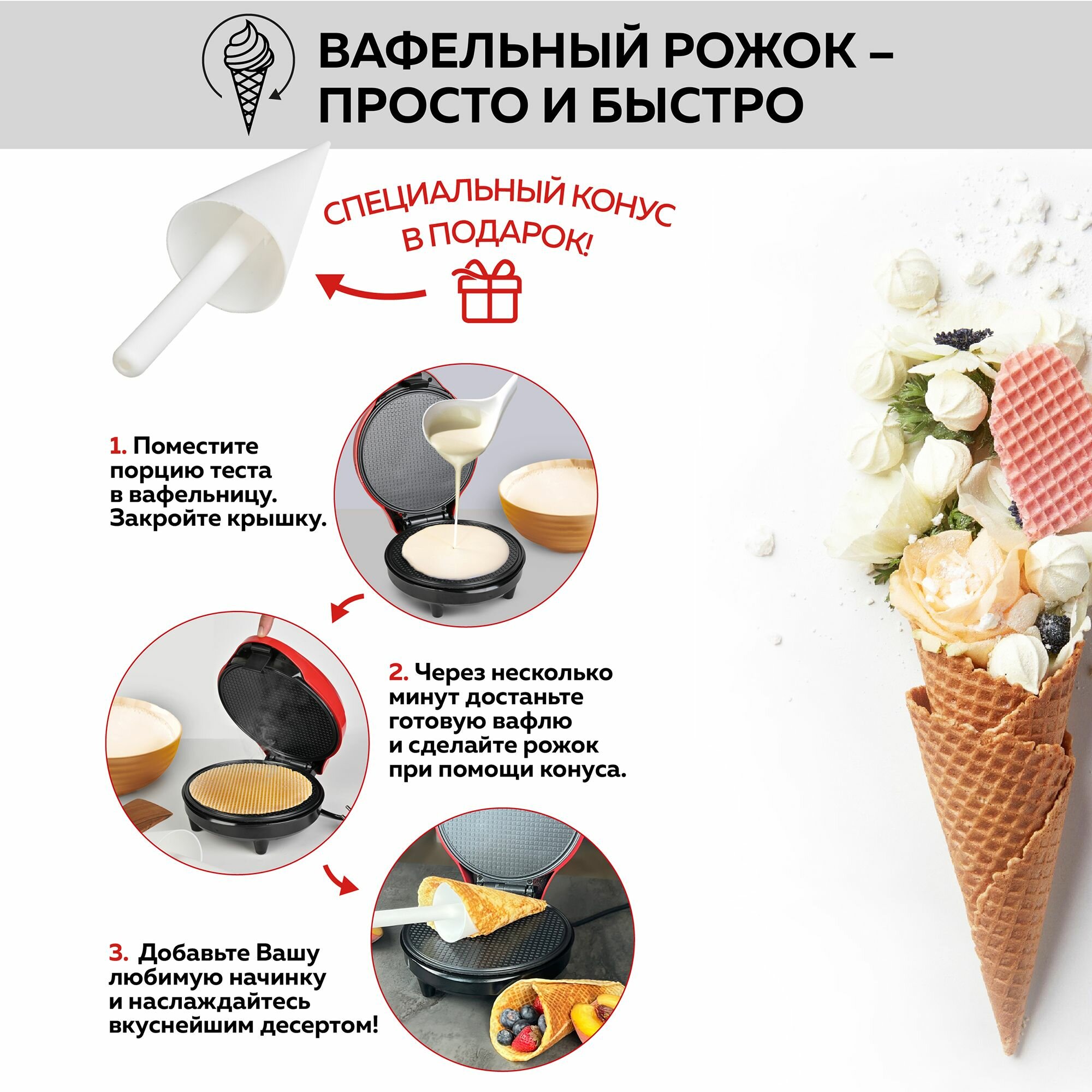 делал стаканчики для мороженого. прилагаемый к вафельнице конус помогает, но всё равно приходится помогать руками - вафля скользит по нему, нужно придерживать пока не сделает оборот и не "закусится".