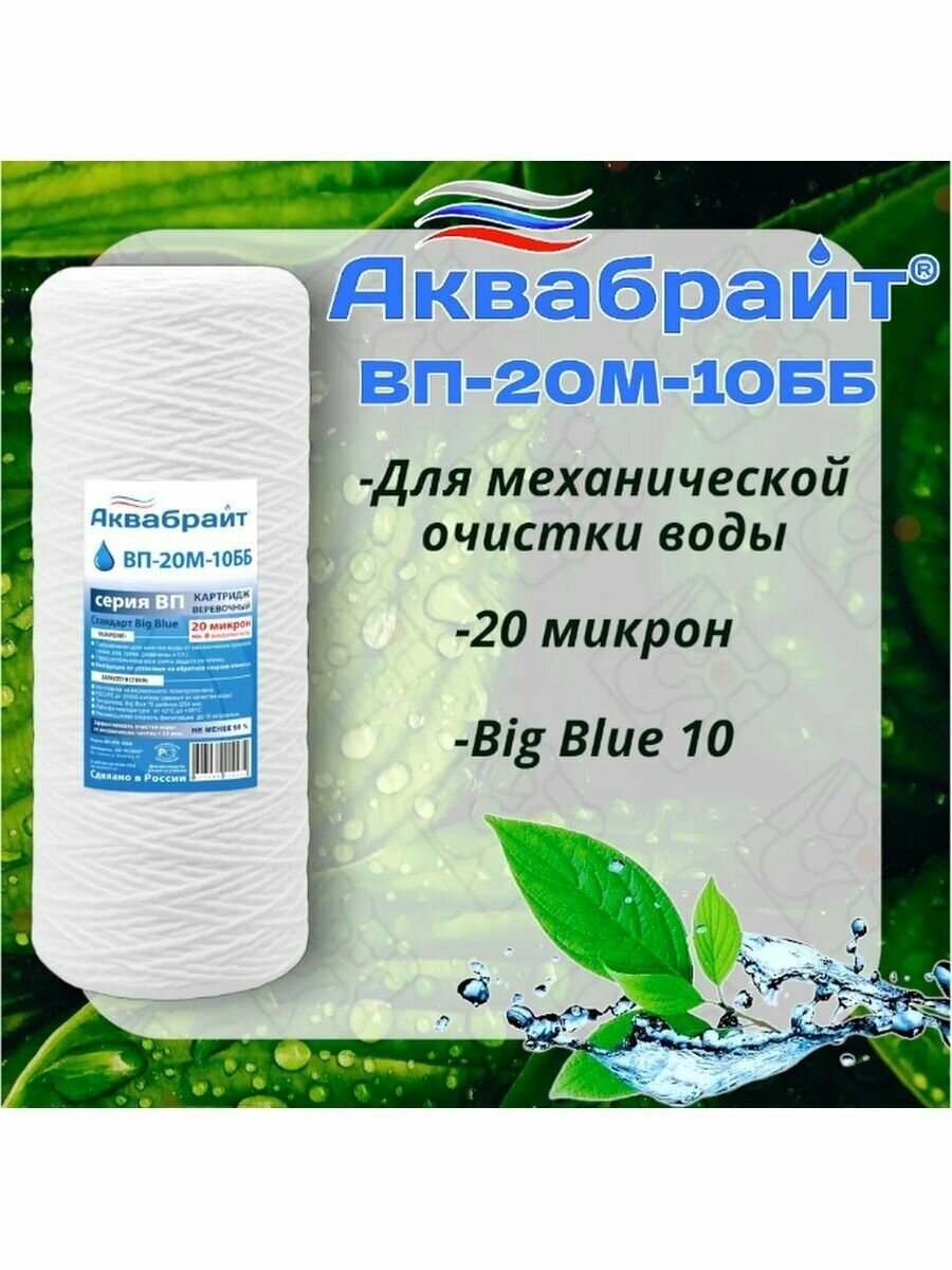 Картридж для механической очистки воды веревочный аквабрайт ВП-20М-10ББ (10 шт.), для фильтра, Big Blue 10, 20 микрон