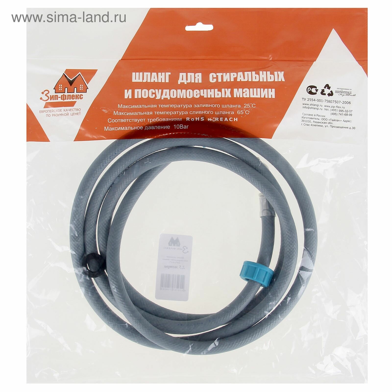 Зип-флекс Заливной шланг для стиральной машины "Зип-флекс", индивидуальная упаковка, 2.5 м