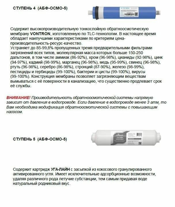 | Дополнительная информация | в комплекте: фильтр с картриджами, обратноосмотическая мембрана, постфильтр, минерализатор, бак накопительный, кран в кухонную мойку, трубка, ключ, подключение к водопроводу, инструкция и гарантийный талон |