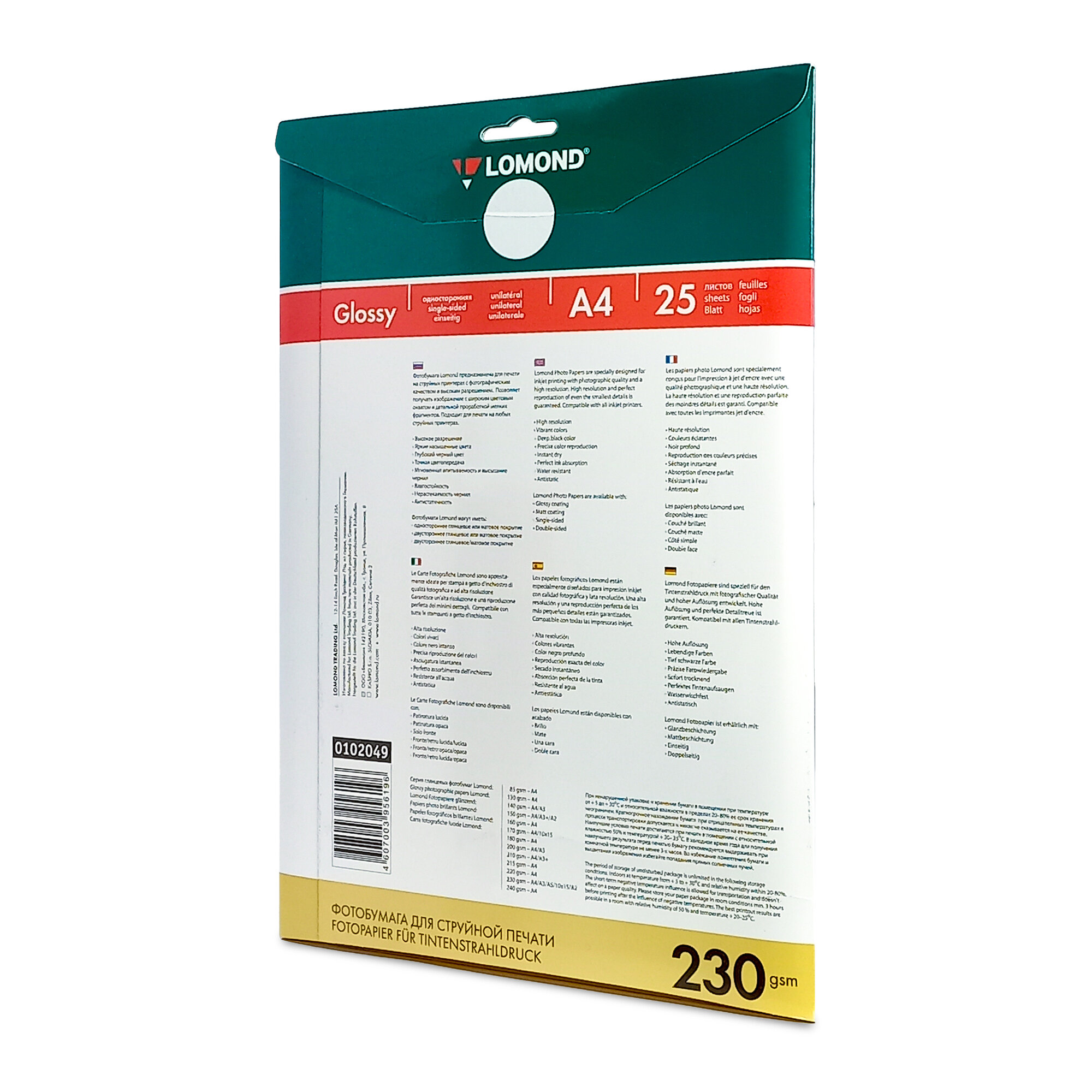 Фотобумага Lomond A4, для струйной печати, 25л, 230г/м2, белый, покрытие глянцевое [0102049]