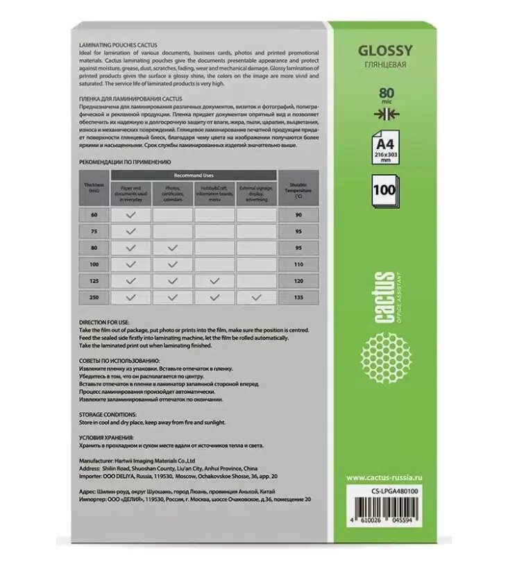 Cactus плёнка для ламинирования Пленка для ламинирования 80мкм A4 100шт глянцевая 216 x 303мм CS-LPGA480100