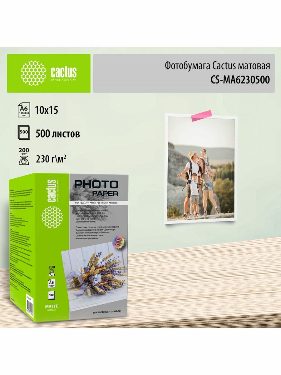Фотобумага Cactus CS-MA6230500, матовая, 10х15, 230 г/м2, 500 листов