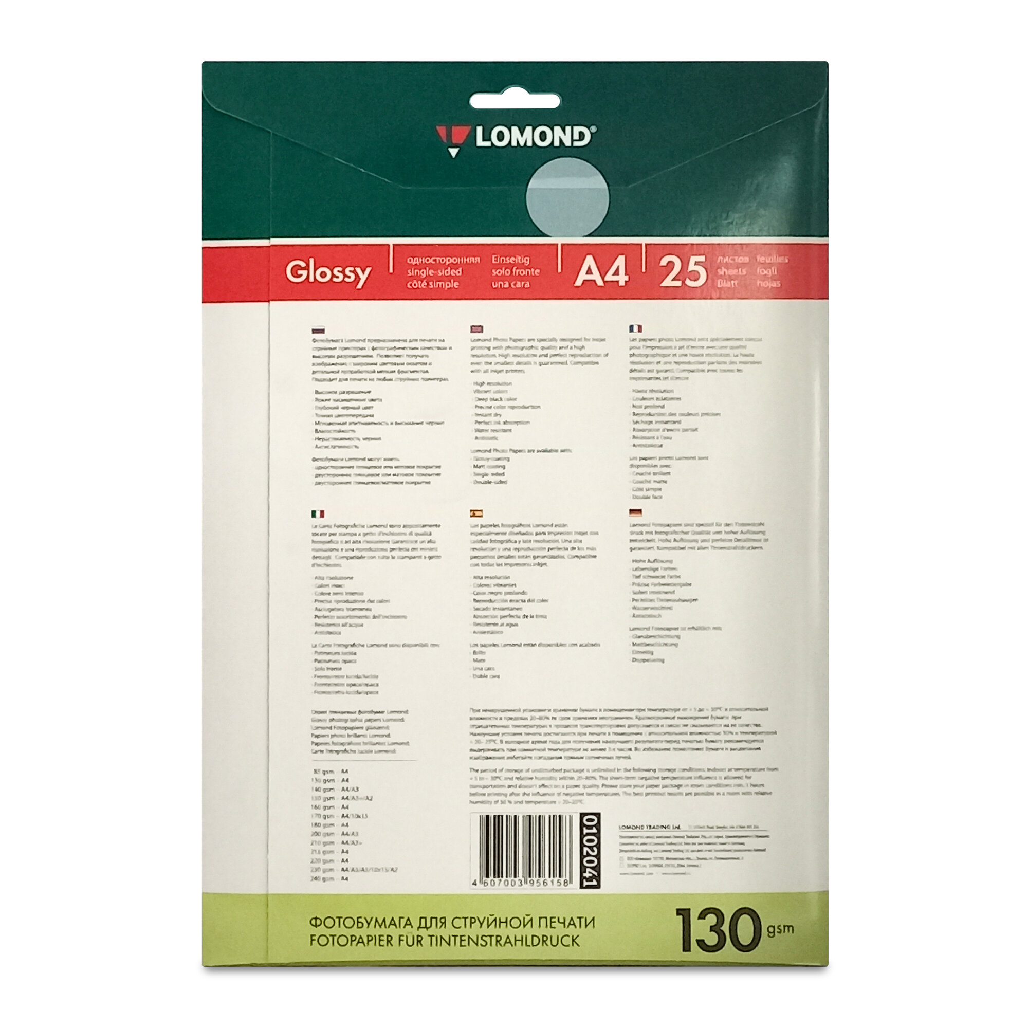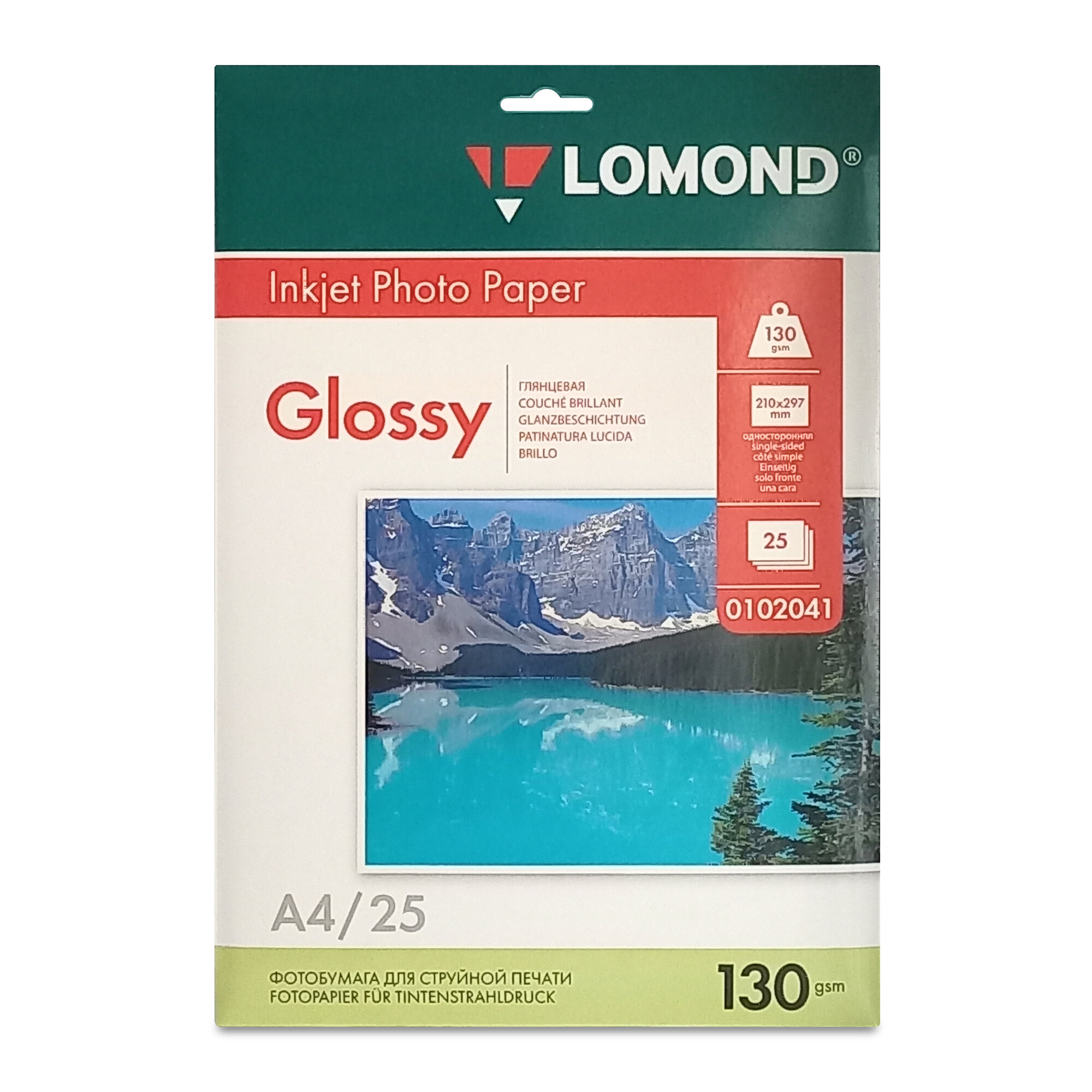 Фотобумага Lomond A4, 130г/м2, 25л, для струйной печати, белый, покрытие глянцевое [0102041]