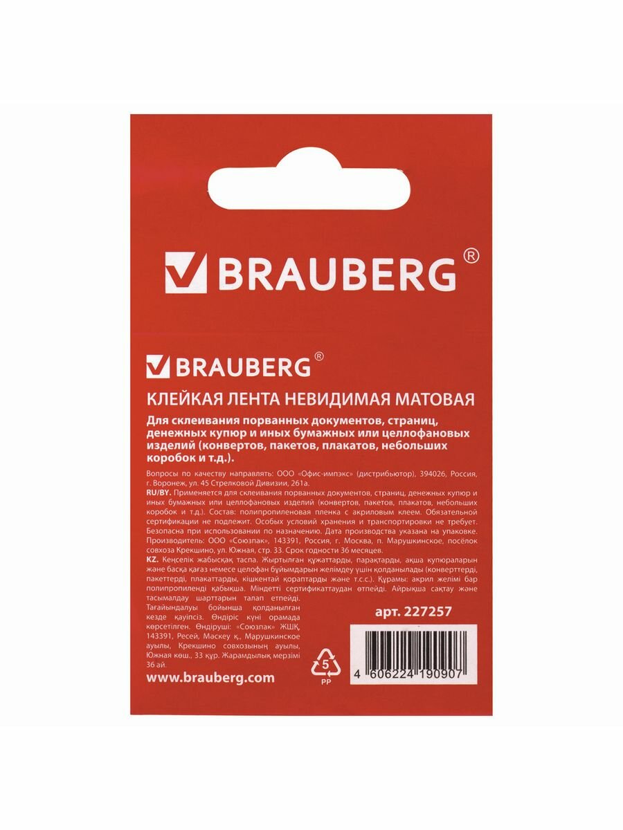 Клейкая лента невидимая, матовая, 12 мм х 33 м, BRAUBERG, 227256 Комплект : 1 шт .
