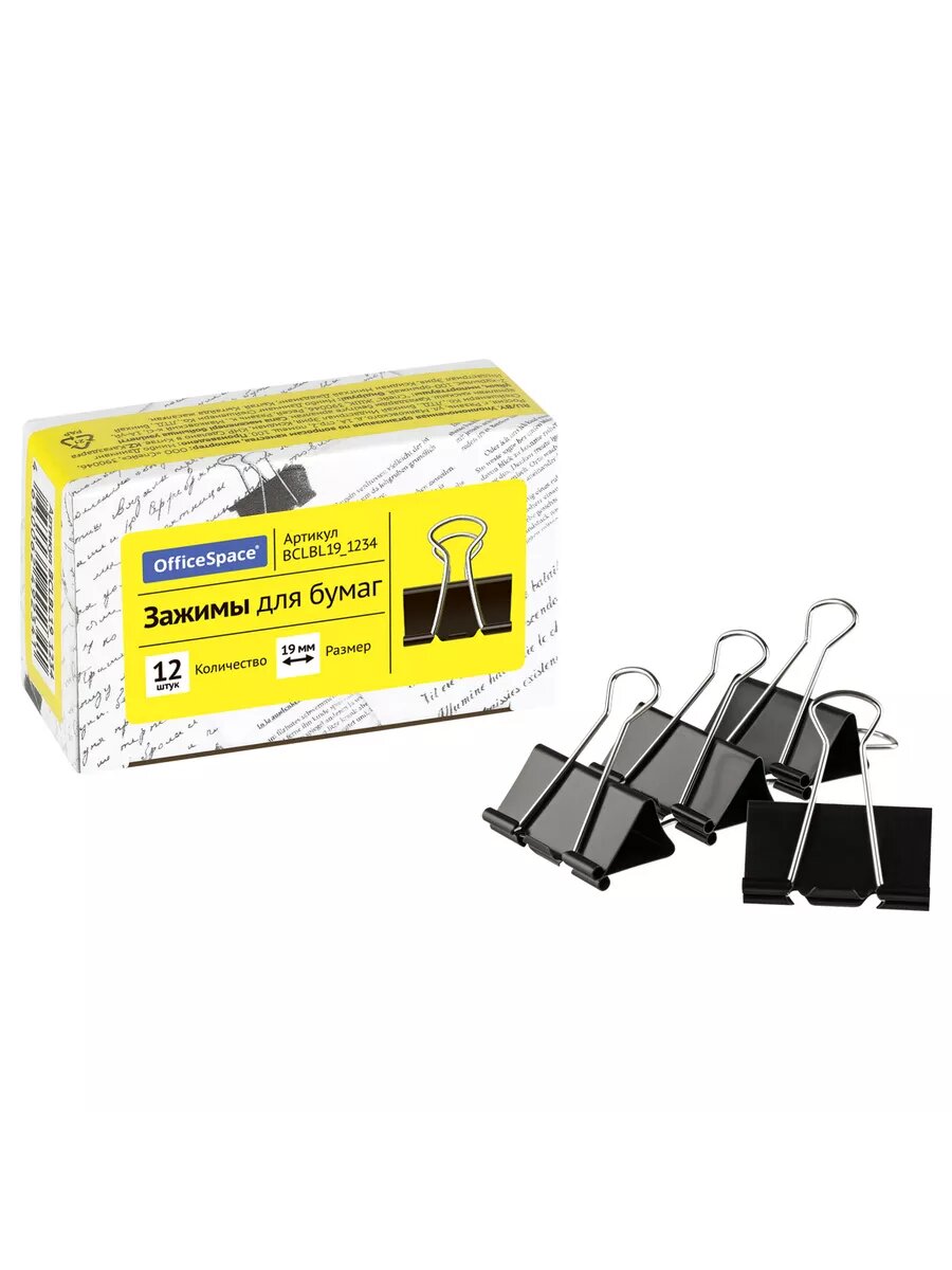 Зажимы для бумаг 19мм, OfficeSpace, 12шт., черные, картонная коробка - 12 шт.