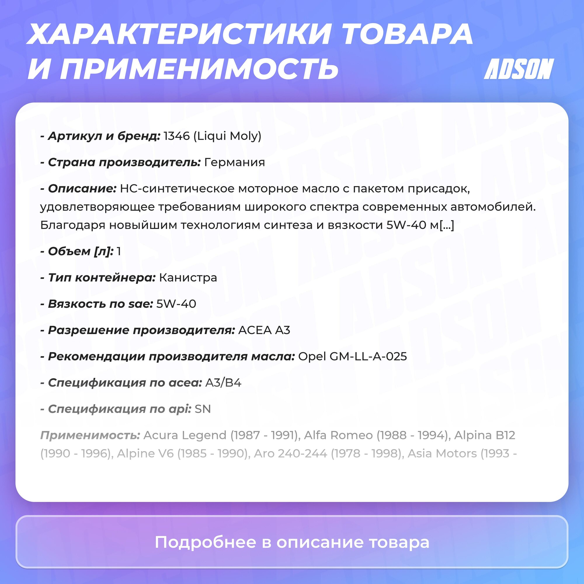 | Допуски OEM | VW 502.00/505.00 / PORSCHE A40 / MB 229.3 / BMW Longlife-98 |