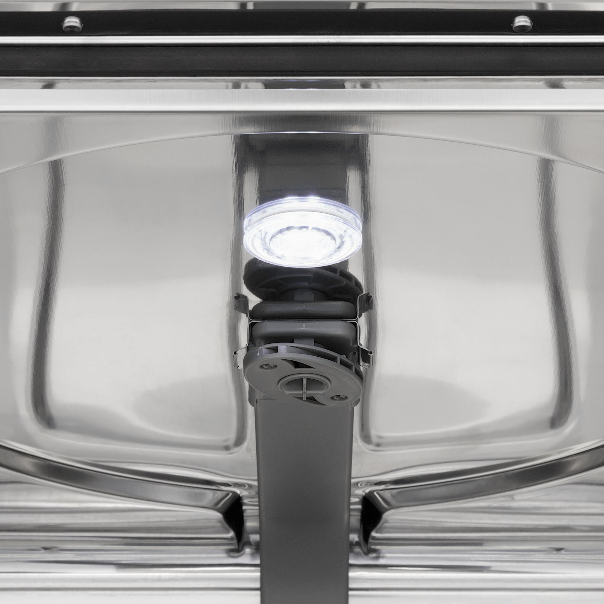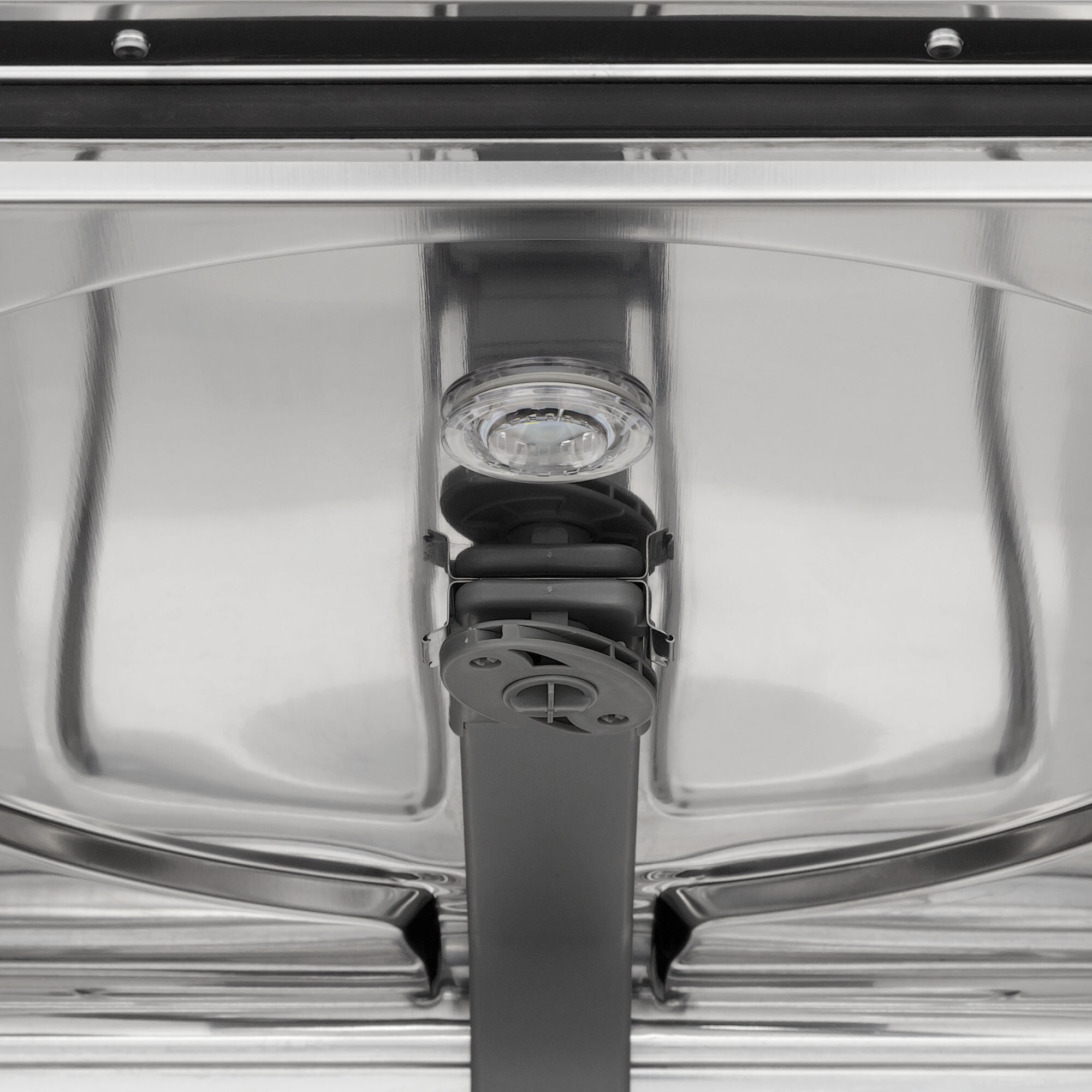 | Плюсы: | Широкая, третья полка для приборов, металлический корпус, подсветка внутри, луч на полу во время мытья, сигнал по окончании, дисплей для выбора программ. |