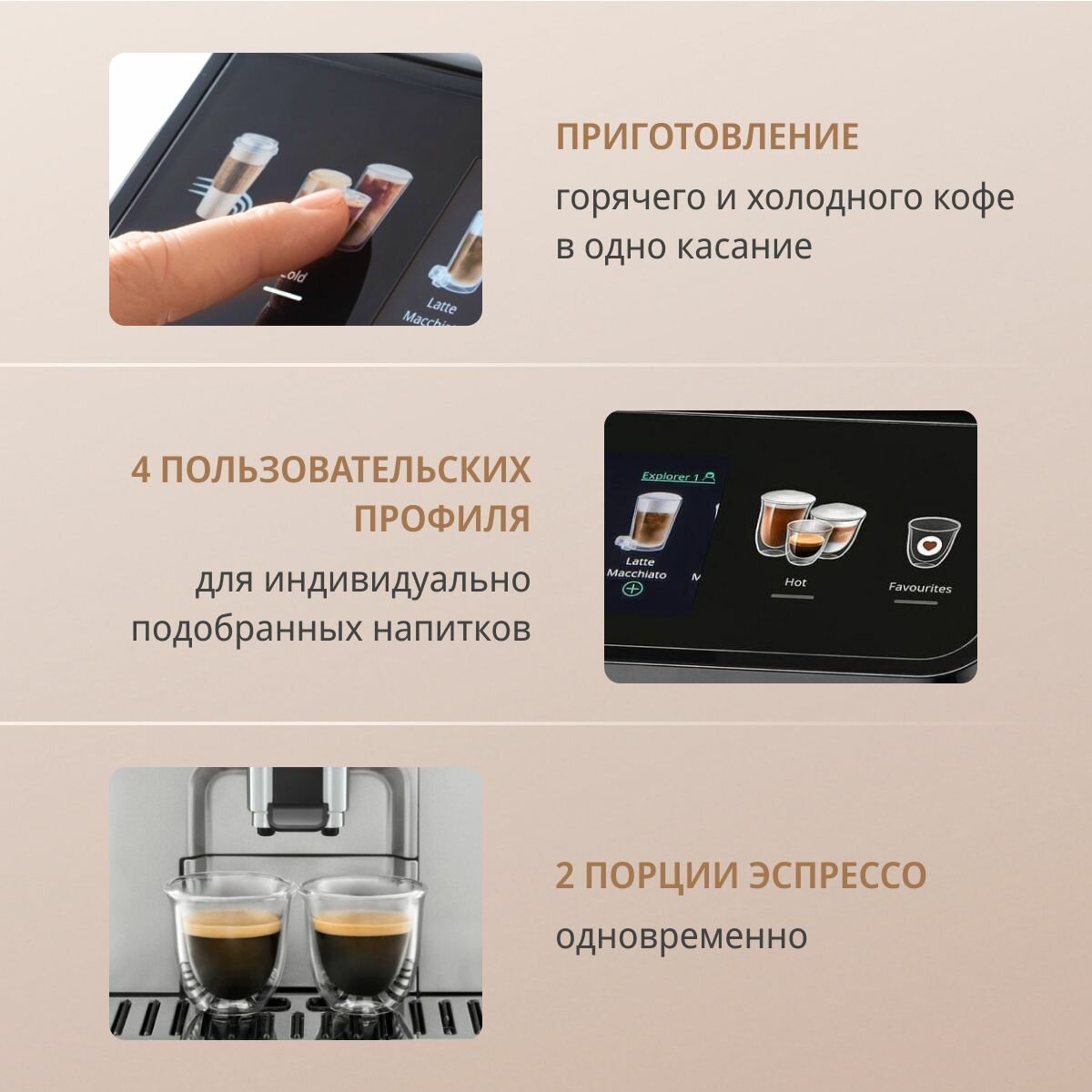 | Дополнительная информация | система горячего и холодного молока Latte crema, красочный дисплей 3.5 TFT с мягким сенсорным управлением, управление через мобльное приложение, два контейнера для молока: Latte Crema Hot и Latte Crema Cool, 4 индивидуальных профиля |