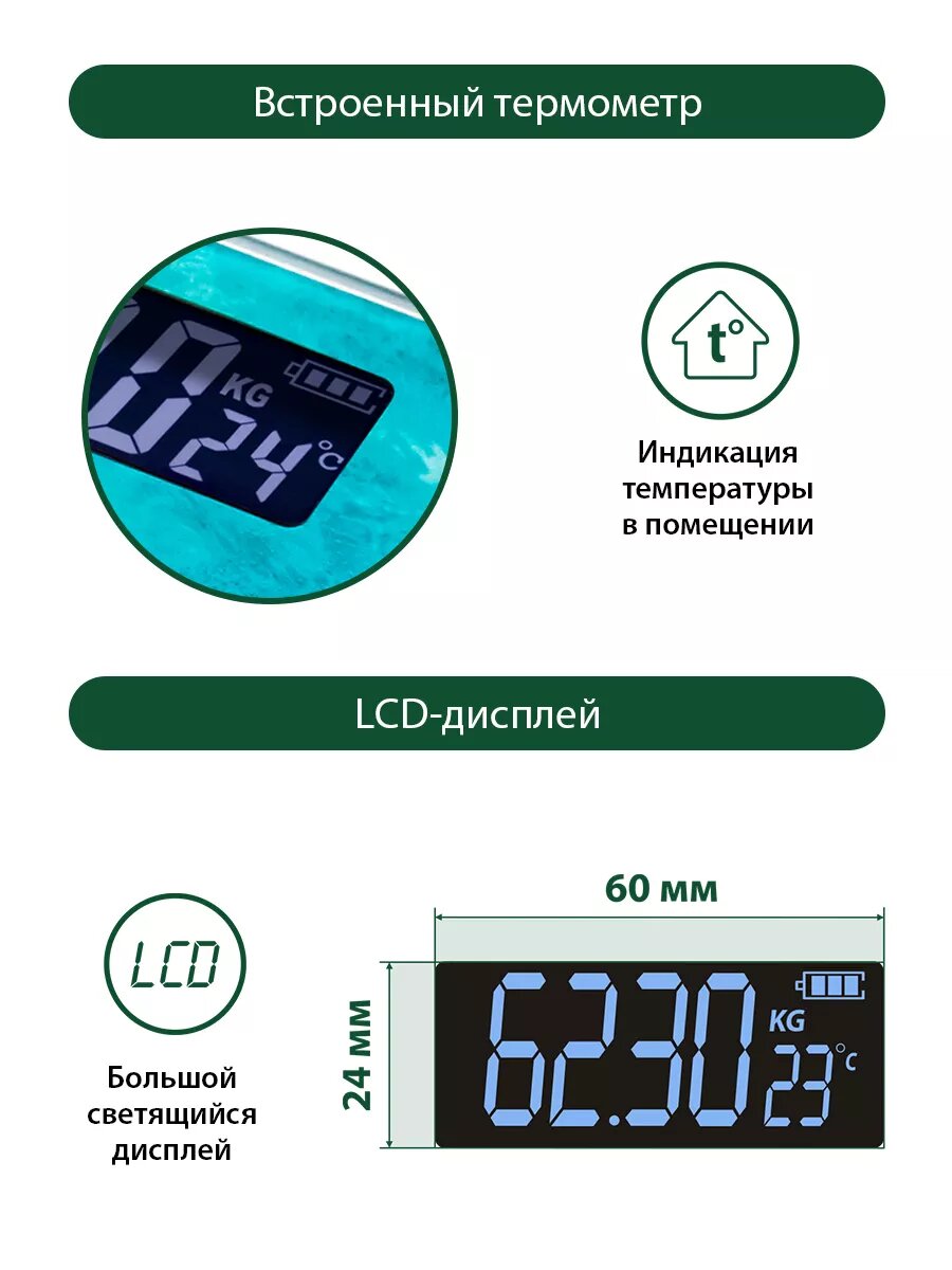 | Дополнительные функции | определение доли жировой ткани / определение доли мышечной ткани / определение доли воды / определение доли костной ткани / расчет ИМТ (BMI) / постановка цели / память |
