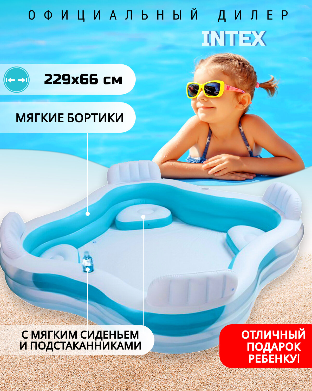 INTEX уценка Бассейн надувной "Семейный" с 4-мя сиденьями 229х229х66 см, от 3 лет, 56475NP