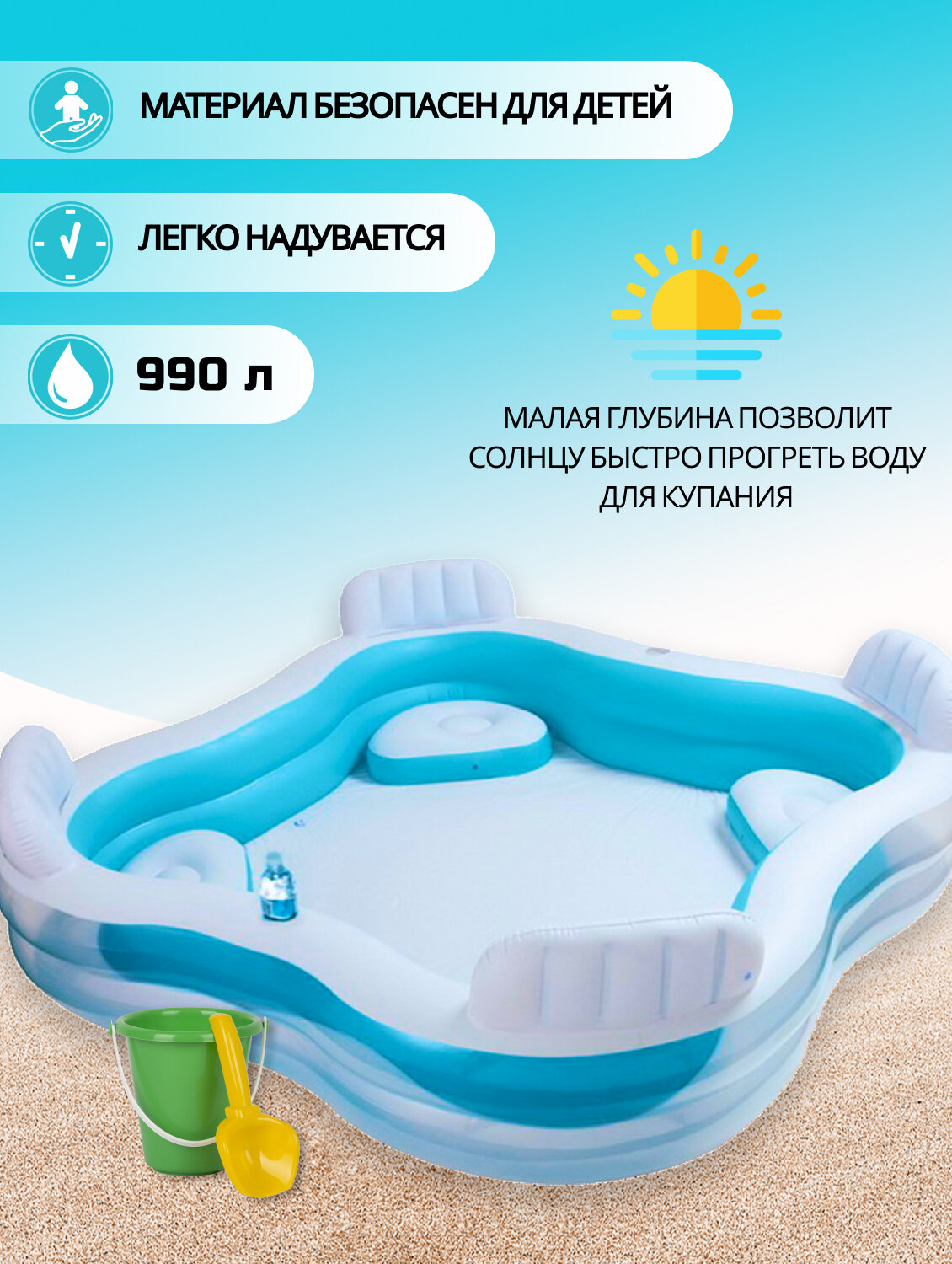 Бассейн надувной "Семейный", с 4 сиденьями, 229 x 229 x 66 см, от 3 лет, 56475NP