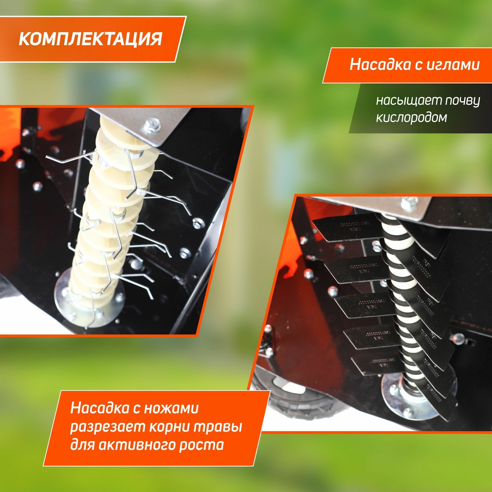 | Комплектация | скарификатор, травосборник, вал c ножами, игольчатый вал |