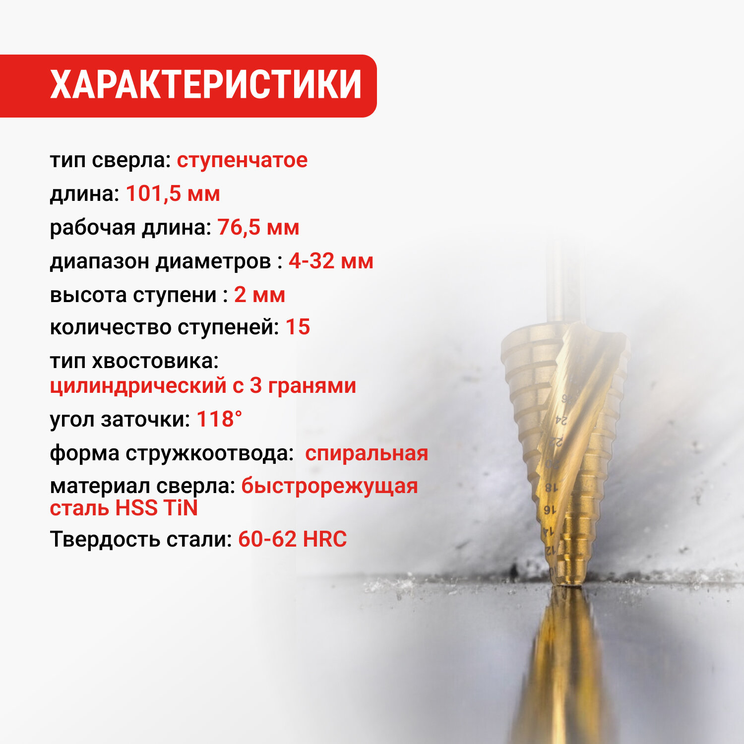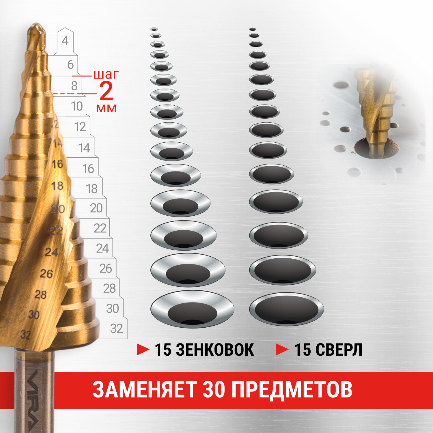 VIRA Сверло ступенчатое спиральное TiN с трёхгранным хвостовиком 4-32 мм 551433