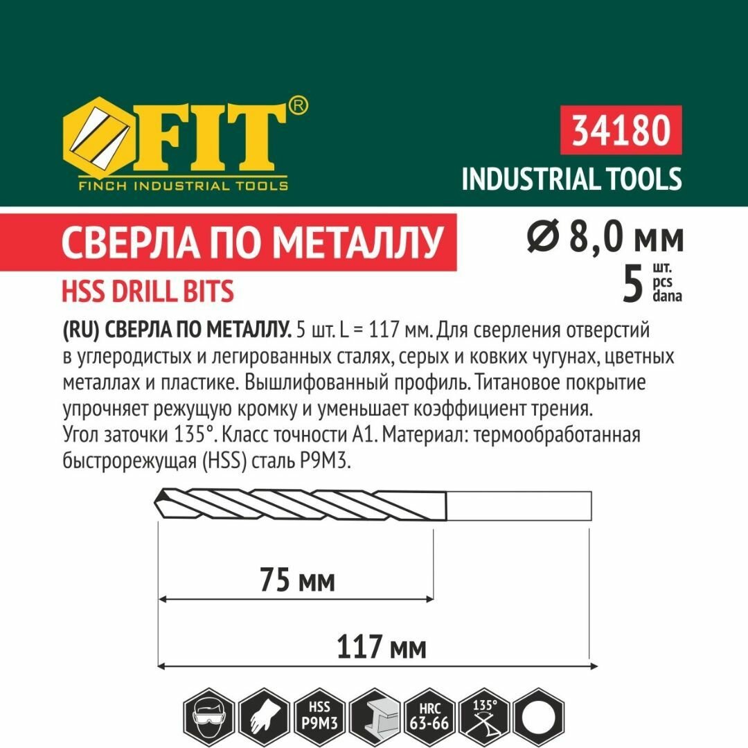 Сверла HSS по металлу, титановое покрытие 8,0 мм ( 5 шт.) 34180