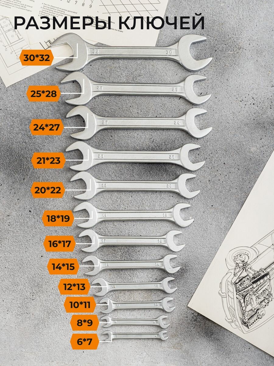 | Гаечные ключи подробно | 6х7, 8х9, 10х11, 12х13, 14х15, 16х17, 18х19, 20х22, 21х23, 24х27, 25х28, 30х32 мм |